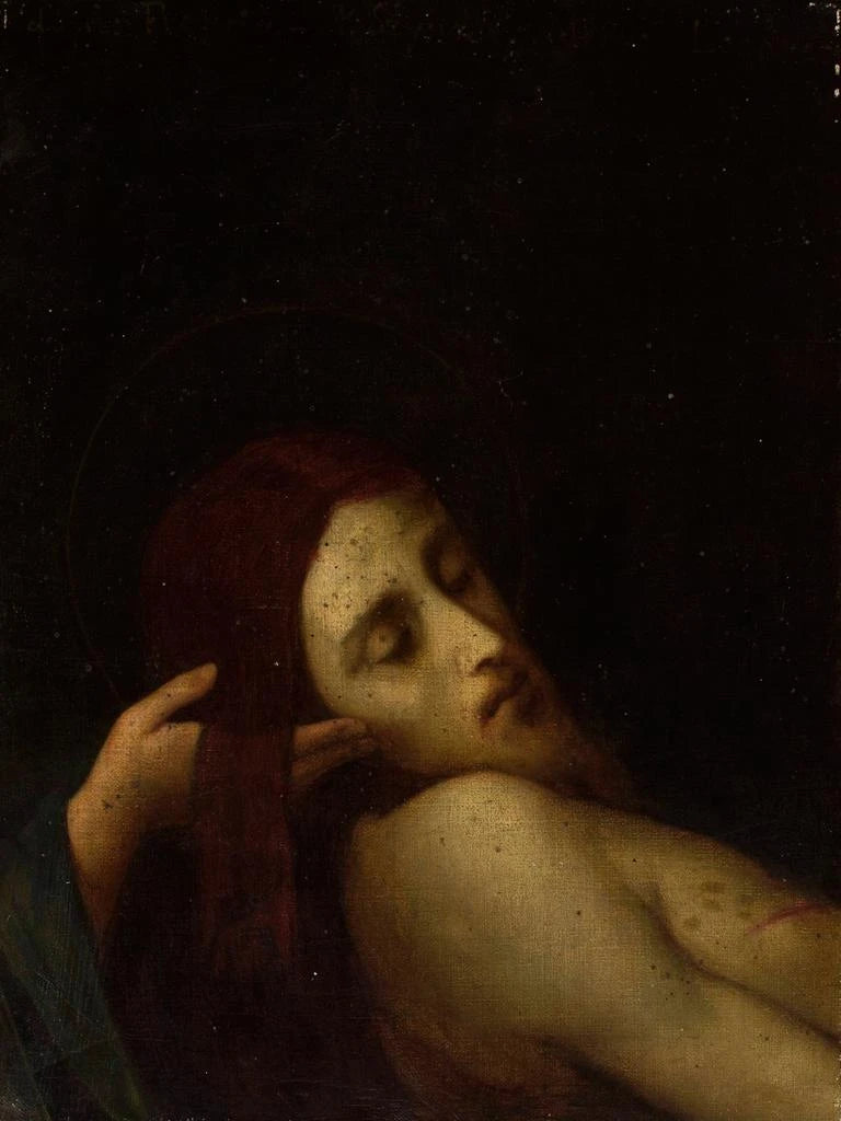 Pantaleon Szyndler, Polish artist of the early 20th century, presents us with 'Head of Christ, fragment of the Pietà,' a work that evokes suffering and redemption through a poignant depiction. Szyndler, influenced by religious tradition, tackles here a classic subject, that of the Pietà, but focusing on the expression of Christ. This fragment, although partial, conveys an emotional power that resonates deeply with the viewer. The finesse of the details and the subtle use of shadows add to the depth of the piece, creating an atmosphere of contemplation. In a contemporary context, this artwork finds its place in interiors seeking to evoke spirituality and sensitivity. For those wishing to incorporate a piece rich in history and emotion into their decor, the art print of this work is available on Artem Legrand.