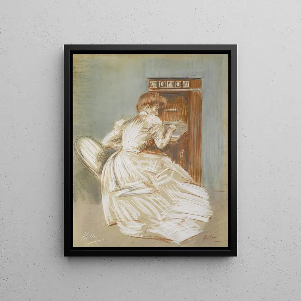 Paul César Helleu, French painter and engraver, is known for his elegant and refined art prints, such as 'Madame Helleu, her secretary'. This piece, which depicts a woman in her intimate environment, reflects the Impressionist style and the artist's sensitivity to light and color. Helleu, active at the end of the 19th century and the beginning of the 20th century, often painted women of high society, capturing their essence with remarkable delicacy. In this work, the play of light on fabrics and objects creates a warm and welcoming atmosphere. Today, this art print is prized not only for its beauty but also for its decorative potential, adding a touch of elegance to any space. For those looking to enrich their interior with a charming and sophisticated piece, the reproduction of this artwork is available on Artem Legrand.