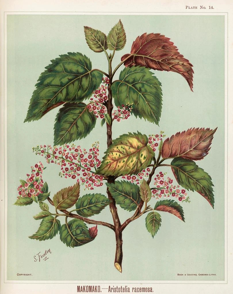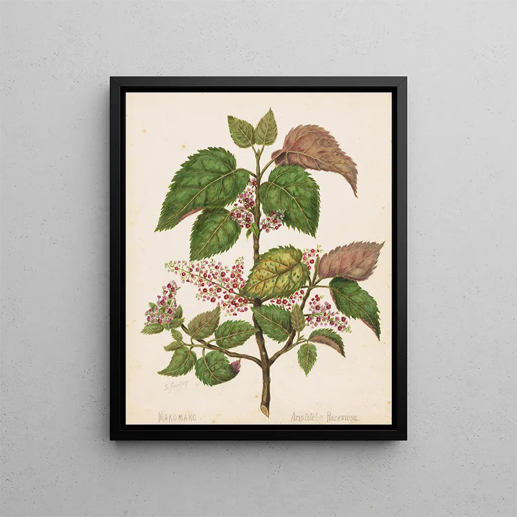 Sarah Featon, a 19th-century New Zealand artist, is renowned for her botanical illustrations with remarkable precision. In 'Makomako Aristotelia racemosa', she captures the beauty and complexity of this endemic New Zealand plant, also known as 'Māori Makomako'. This artwork is part of a series of plates highlighting the region's unique flora, reflecting the growing interest in botany at the time. Featon's style, both detailed and delicate, allows for appreciation of every nuance of the plant, paying homage to the natural richness of her country. Today, this piece can bring a touch of nature and freshness to any interior, inviting a soothing contemplation. The art print of this work is available on Artem Legrand.