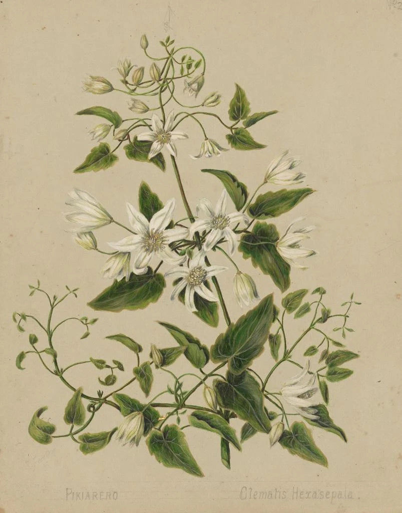 In 'Pikiarero Clematis hexasepala', Sarah Featon offers us a poetic vision of a climbing plant typical of New Zealand. Her illustration stands out for its meticulous details and a palette of soft colors that evoke the delicacy of this species. As a botanical artist, Featon has captured the essence of the local flora while incorporating an aesthetic sense that transcends simple representation. This artwork testifies to Featon's commitment to botany and her desire to share the beauty of her environment. In a contemporary setting, this illustration can bring a touch of nature and elegance, inviting serenity. The art print of this piece is available to discover on Artem Legrand.