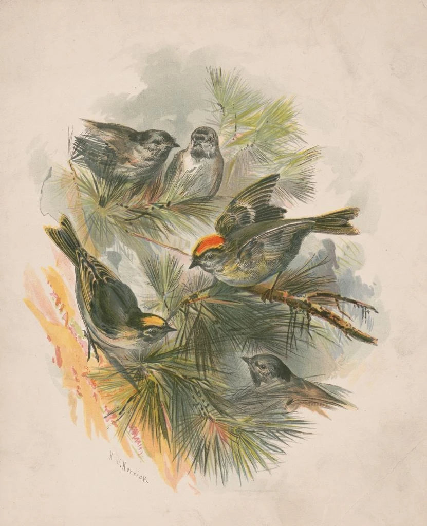 Oiseaux sur des branches de pin - Henry Walker Herrick
