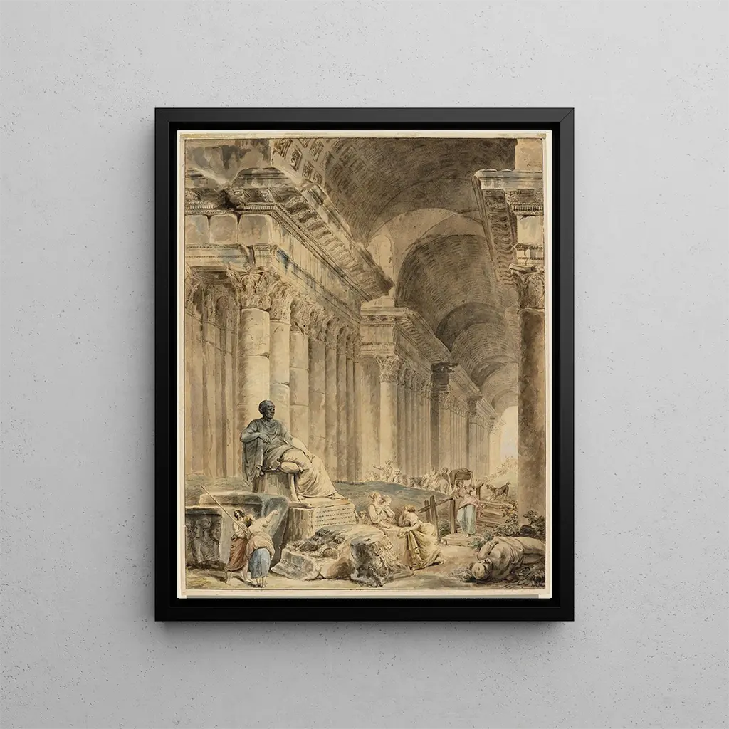 Galerie à colonnes voûtées avec statue antique assise - Hubert Robert