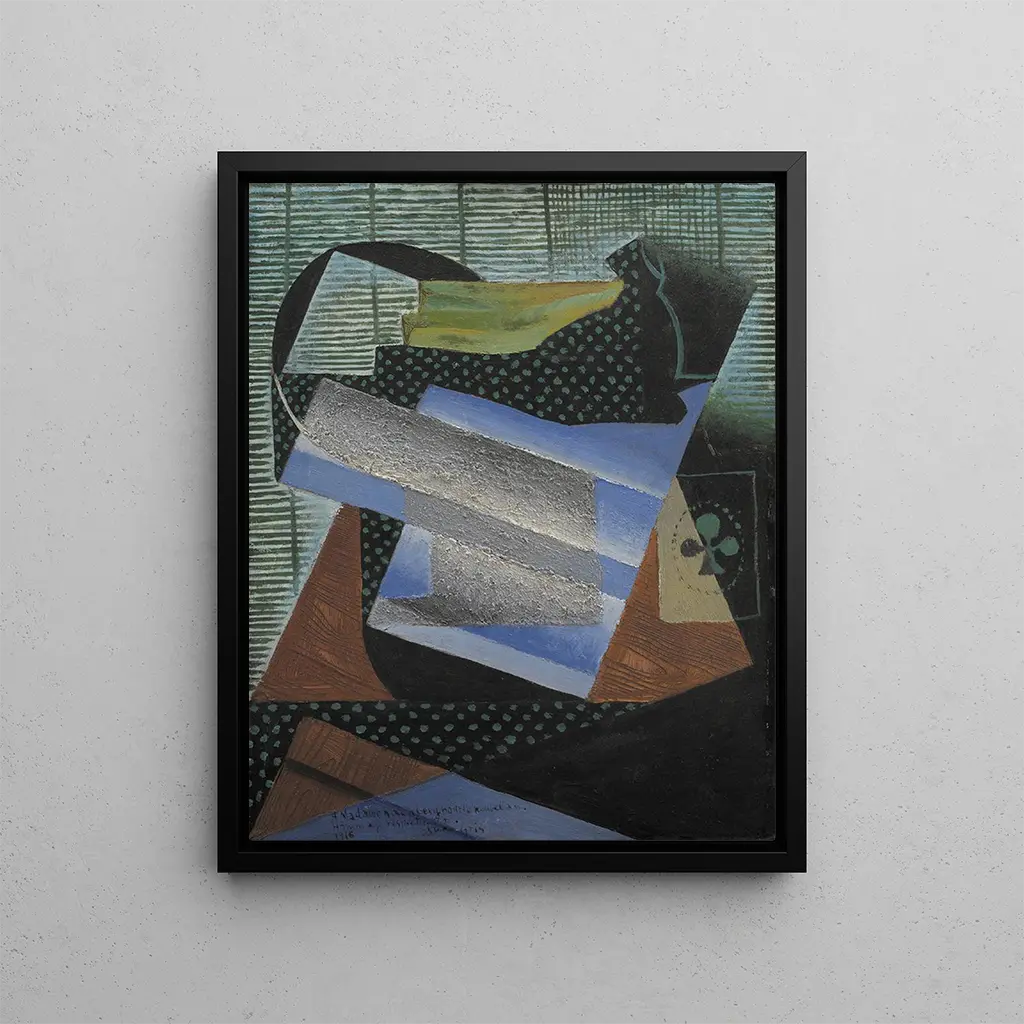 The art print of Juan Gris's still life immerses us in a universe where everyday objects transform into a visual symphony. Geometric shapes intertwine with vibrant colors, creating an atmosphere that is both dynamic and soothing. Gris, a master of Cubism, uses collage and overlay techniques to bring to life objects such as fruits, bottles, and books. Each element is carefully arranged, inviting the viewer to explore the relationships between the objects and their environment. Light plays a crucial role, accentuating volumes and textures while infusing an almost poetic dimension into this composition.