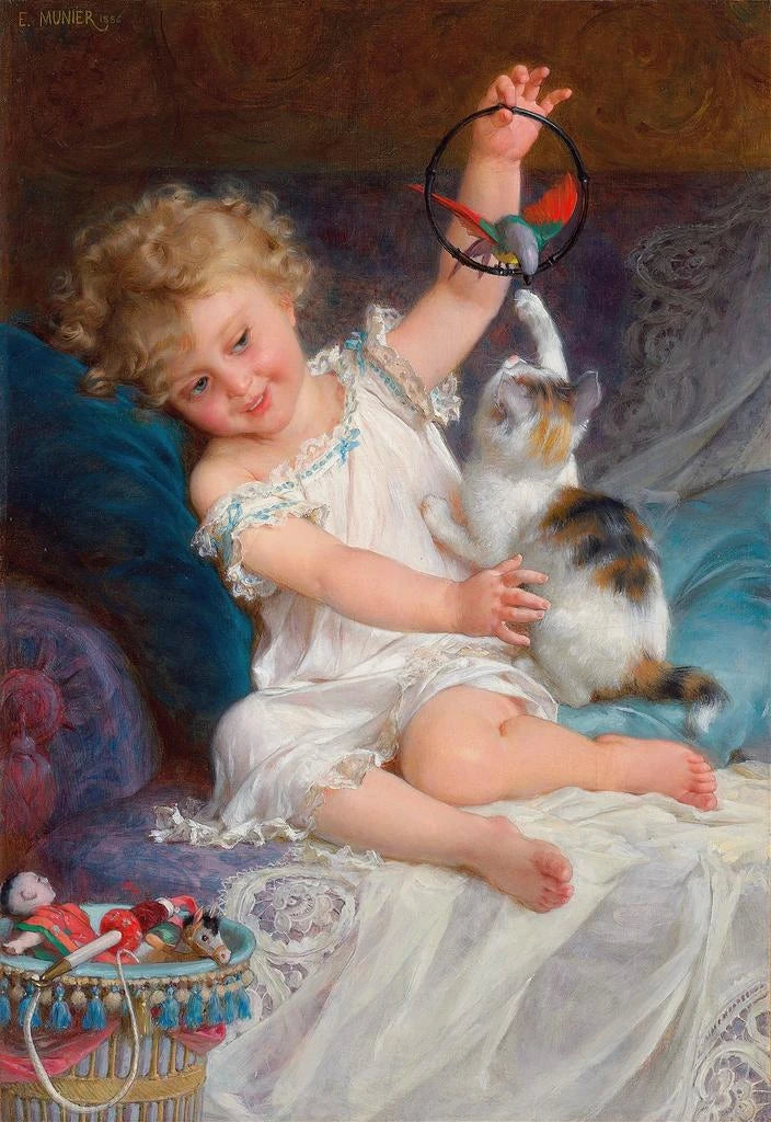 Émile Munier, active during the second half of the 19th century, became known for his depictions of daily life, especially those highlighting childhood. Influenced by realism and romanticism, he captured simple yet emotionally charged moments. His work reflects a particular sensitivity to human relationships and fleeting moments of happiness. Munier was also an active member of Parisian salons, where his paintings were widely appreciated, solidifying his place in French art history.