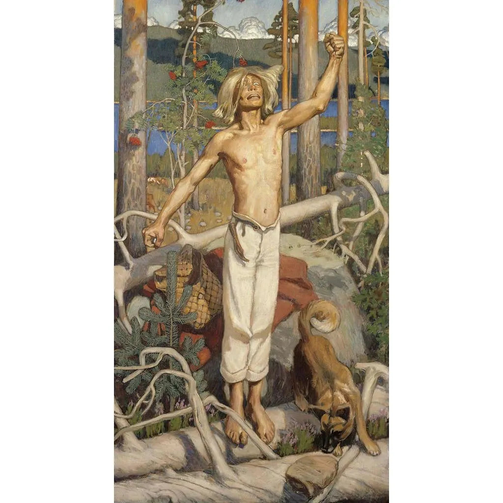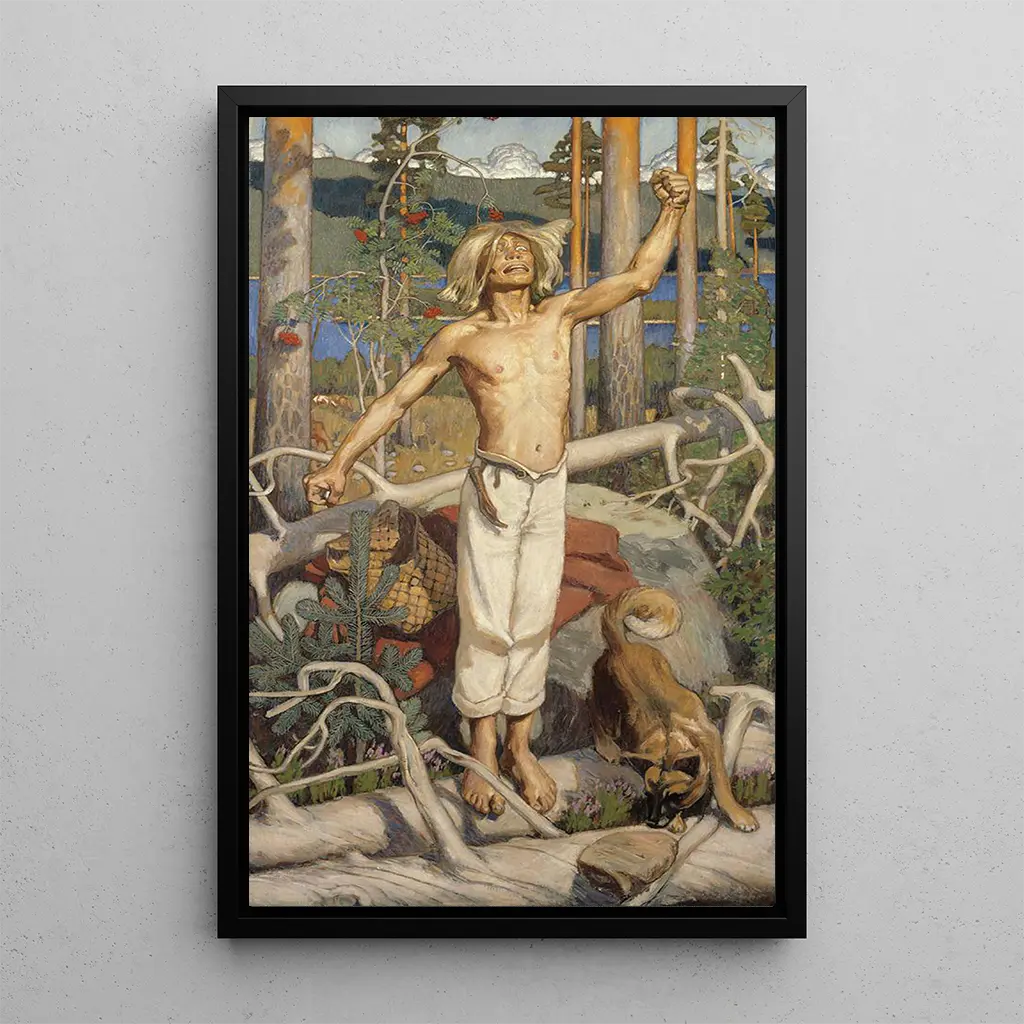 Kullervo Cursing: An Art Print Rich in Tragedy and Passion Kullervo Cursing, an iconic art print by Akseli Gallen-Kallela, immerses the viewer in a universe of despair and inner struggle. The dynamic composition, where the central figure stands with intensity, is accentuated by dark colors and touches of red, symbolizing anger and pain. Gallen-Kallela's technique, blending realism and symbolism, creates a poignant atmosphere, where every detail tells a story. This art print, inspired by Finnish mythology, evokes universal themes such as revenge and fatality, inviting deep reflection on the human condition. A decorative art print with multiple qualities The reproduction of Kullervo Cursing is a centerpiece that will add a touch of emotion and depth to your interior. Whether in a living room, office, or bedroom, this captivating art print draws the eye and sparks curiosity. The quality of the reproduction guarantees remarkable fidelity to the details of the original artwork, allowing you to feel the full power of Gallen-Kallela's art. With its undeniable aesthetic appeal, this canvas becomes not only a decorative element but also a source of inspiration and reflection for those who contemplate it.