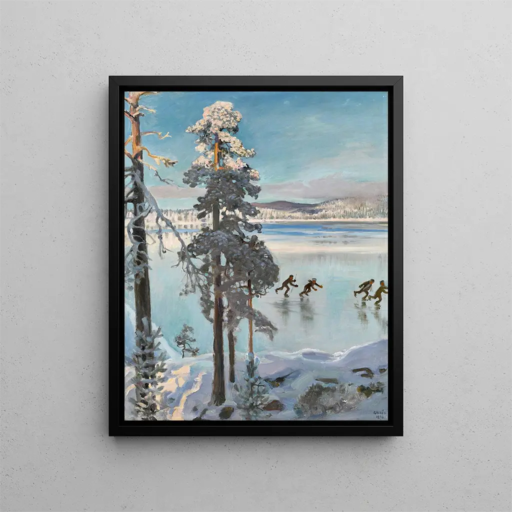 The art print "Skaters on Lake Ruovesi" by Akseli Gallen-Kallela is an iconic piece that evokes the wild beauty of Finland. In this composition, the artist captures a fleeting moment, where skaters glide harmoniously on a frozen lake, surrounded by the serenity of a winter landscape. This work is much more than a simple representation of nature; it embodies the spirit of a time and culture, while offering an immersion into a universe where movement and tranquility coexist. With its soft light and delicate hues, this art print invites contemplation, transporting the viewer into a world imbued with poetry and nostalgia.