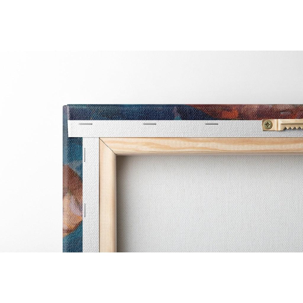 Canvas, matte finish print, mounted on a wooden structure, ready to hang. Framing options available on certain sizes.