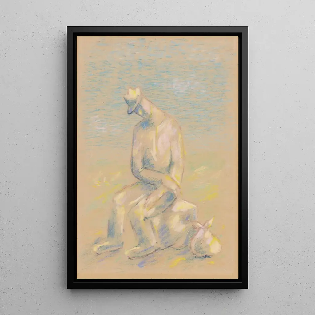 The art print "Émigrant" by Mikuláš Galanda immerses us in a poignant atmosphere, where dark colors and expressive strokes evoke melancholy and hope. The composition, centered on the figure of a man with a lost gaze, reflects an inner journey filled with memories and desires. Shades of earth and blue blend skillfully, creating a striking contrast that captures the eye and invites reflection. This canvas, both simple and profound, captures the essence of the human experience in the face of the unknown.