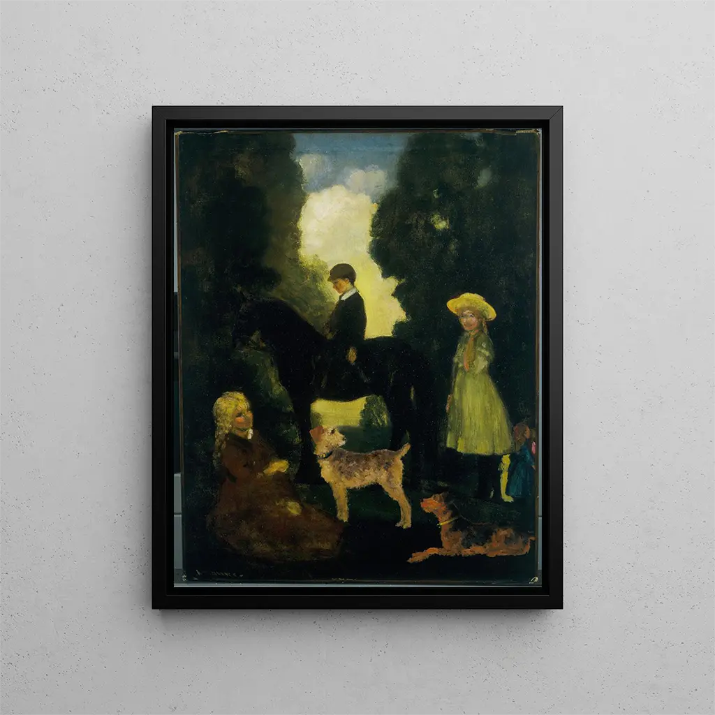 Enfants, chiens et poney - Arthur Bowen Davies – Introduction captivante Dans le vaste panorama de l'histoire de l'art, certaines œuvres parviennent à capturer une essence unique, un instant suspendu entre rêve et réalité. "Enfants, chiens et poney - Arthur Bowen Davies" s'inscrit parfaitement dans cette catégorie. Cette œuvre évoque une scène bucolique où la joie de l'enfance se mêle à la douceur de la nature. À travers une palette de couleurs délicates et une composition harmonieuse, Davies réussit à transporter le spectateur dans un monde empreint de sérénité et d'innocence. Les enfants, entourés de leurs compagnons canins et d'un poney, semblent s'épanouir dans un espace où le temps s'arrête. Cette représentation idyllique invite à la contemplation et à l'évasion, faisant de l'œuvre un véritable tableau de vie. Style et singularité de l’œuvre Le style distinctif d'Arthur Bowen Davies se manifeste à travers une approche à la fois symboliste et impressionniste. Dans "Enfants, chiens et poney", les formes sont fluides, presque éthérées, et les contours se fondent dans un environnement naturel luxuriant. Les figures des enfants sont traitées avec une tendresse palpable, leurs expressions capturant l'émerveillement et la curiosité. Les animaux, quant à eux, ajoutent une dimension vivante à la scène, soulignant le lien profond entre l'homme et la nature. La lumière joue un rôle primordial, créant des ombres douces qui enveloppent les personnages et accentuent la chaleur de l'instant. Cette œuvre ne se contente pas de représenter une simple scène de la vie quotidienne ; elle évoque des sentiments universels de joie, de liberté et d'harmonie, des émotions qui résonnent encore aujourd'hui. L’artiste et son influence Arthur Bowen Davies, figure emblématique du début du XXe siècle, a su s'imposer par son style novateur et sa vision artistique. Influencé par le symbolisme et le post-impressionnisme, il a exploré des thèmes liés à la nature, à l'enfance et à la spiritualité. Son œuvre a été marquée par un désir de transcender la réalité, cherchant à exprimer des vérités plus profondes à travers des images poétiques. Davies a également joué un rôle clé dans le développement de l'art américain, contribuant à la reconnaissance des artistes contemporains de son époque.