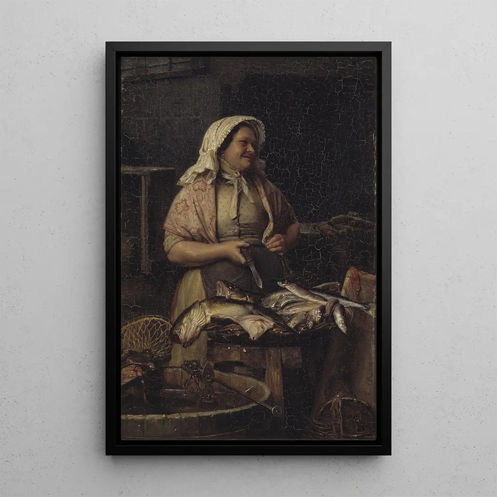 In this art print of the work "A woman selling fish," Carl Bloch captures the simplicity and beauty of everyday life. The composition is dominated by earthy tones, evoking the lively market where the woman, at the center of the piece, draws the eye. The meticulous details of the fish displayed on her stall, as well as the focused expression of the vendor, create a lively and realistic atmosphere. Bloch's oil painting technique allows for striking rendering of textures and reflections, immersing the viewer in a scene that feels almost tangible.