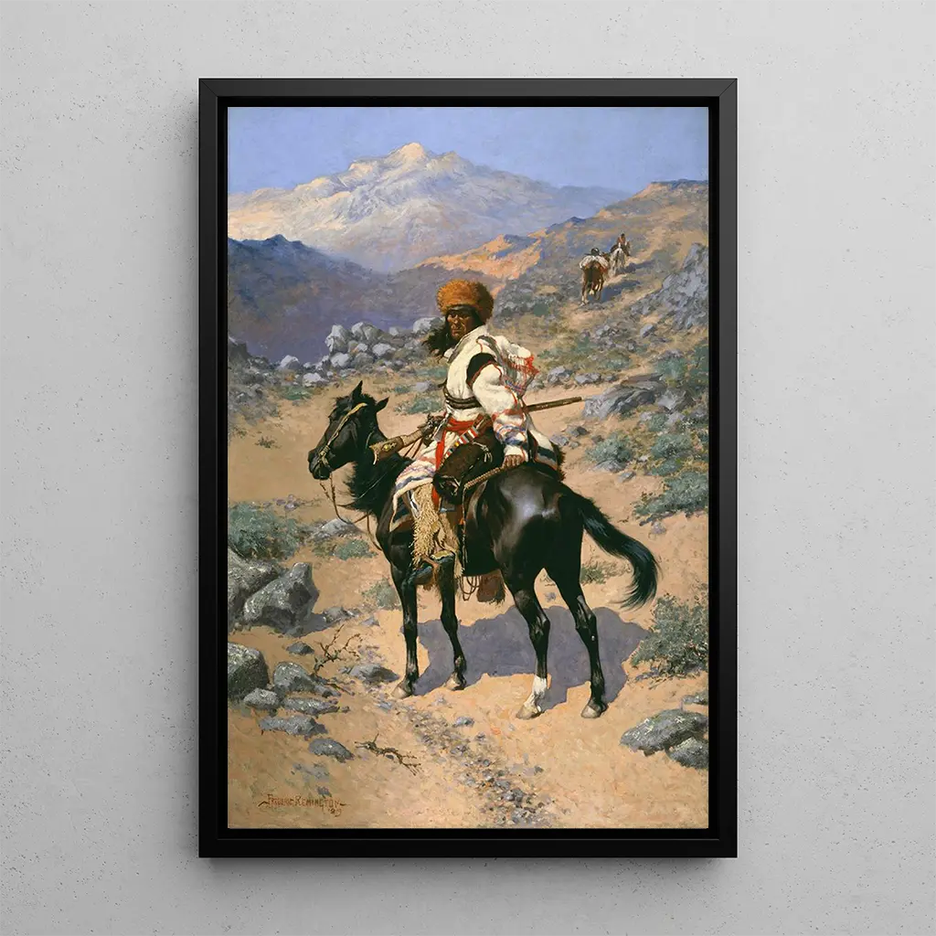 A Native American trapper: an ode to wilderness and heroism In "A Native American trapper," Frederic Remington captures the very essence of the wild American frontier through a dynamic and evocative composition. The painting depicts a proud and resilient trapper in the midst of nature, surrounded by majestic landscapes. The earthy tones and shades of green evoke the richness of wildlife and flora, while the oil painting technique gives a vibrant texture to the artwork. The atmosphere conveyed by this canvas is both heroic and contemplative, inviting the viewer to immerse themselves in a world where man and nature coexist in harmony. Frederic Remington: the pioneer of western art Frederic Remington, born in 1861, is an iconic artist of the American western movement. Influenced by his travels in the wild West, he skillfully translated the spirit of the era through his works. Remington was not only a painter but also a sculptor and illustrator, contributing to shaping the romantic image of cowboys and Native Americans in popular culture. His style, imbued with realism and dynamism, marked the end of the 19th century and the beginning of the 20th century, making him an essential figure in American art. His works, including "A Native American trapper," continue to inspire and fascinate, bearing witness to the cultural heritage of the West. A decorative acquisition with multiple assets The art print of "A Native American trapper" is a decorative piece that will enhance any space, whether a living room, office, or bedroom. Its print quality guarantees remarkable fidelity to the original details and colors, allowing you to fully enjoy Remington's work. With its undeniable aesthetic appeal, this canvas adds a touch of authenticity and character to your interior. By choosing this art print, you opt for a decorative element that evokes adventure and the beauty of nature, while celebrating American artistic heritage.