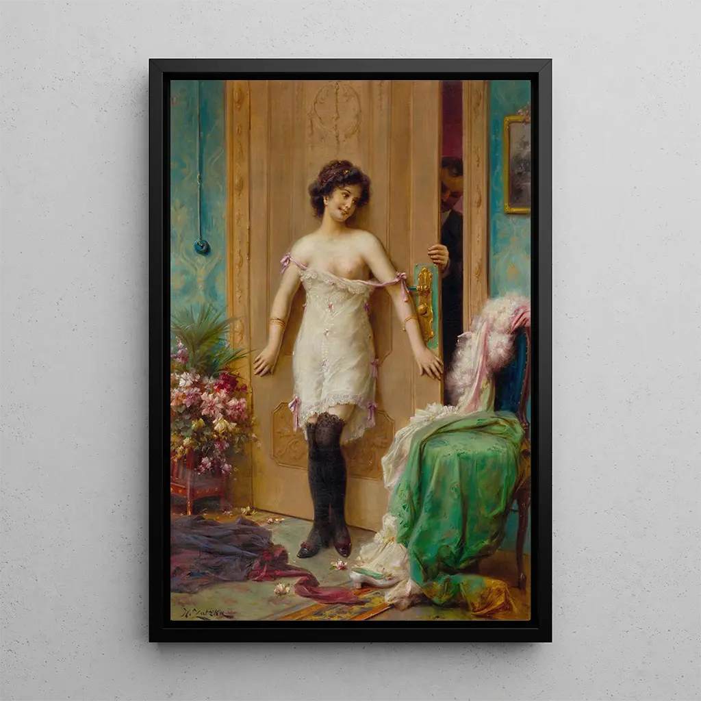 La Tentation : an exploration of human desires In the art print of "La Tentation," Hans Zatzka immerses us in a universe where desire and spirituality intertwine. The scene, rich in warm colors and meticulous details, highlights a central figure, often interpreted as an allegory of sin. Shadows and lights create an atmosphere that is both intriguing and unsettling, where each element seems charged with meaning. Zatzka's technique, blending realism and symbolism, invites us to reflect on human nature and its inner struggles with temptations. Hans Zatzka : an artist at the crossroads of influences Hans Zatzka, active at the end of the 19th century, established himself in the European artistic landscape with his unique style. Influenced by symbolism and romanticism, he explored profound themes such as temptation, faith, and redemption. His works, often imbued with mystery, reflect the concerns of his era, where spirituality and existential questions were at the heart of debates. Zatzka captured the essence of these themes, making him an essential artist for those interested in religious and symbolic art. A decorative art print with multiple assets The art print of "La Tentation" is an ideal choice to enhance your interior decoration, whether in a living room, office, or bedroom. Its printing quality, faithful to the original artwork, allows you to savor every nuance and detail. This painting, with its captivating aesthetic, becomes a true focal point in your space, inspiring admiration and reflection. By integrating this canvas into your decor, you bring an artistic and spiritual dimension that elevates the ambiance of your interior, while offering a source of daily inspiration.