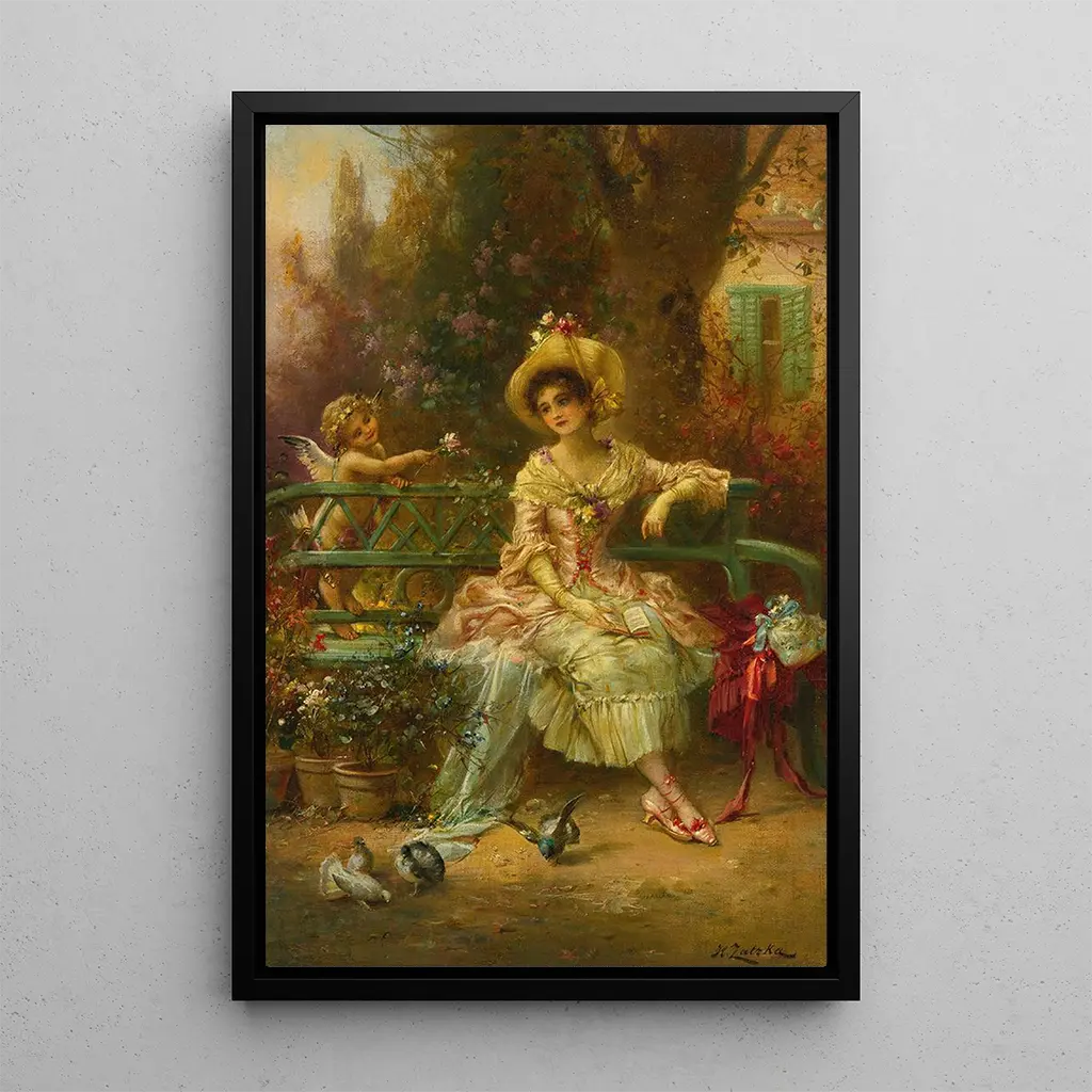 Thinking of Him by Hans Zatzka is an art print that evokes deep introspection and delicate melancholy. The composition features a young woman, immersed in her thoughts, surrounded by a lush floral frame. The soft pastel colors, such as pinks and blues, create a dreamy and nostalgic atmosphere. Zatzka's technique, with its delicate brushstrokes and refined details, gives this canvas an intimate ambiance. Each view of this art print invites you to feel the emotions of the protagonist, making this work a true mirror of the soul.