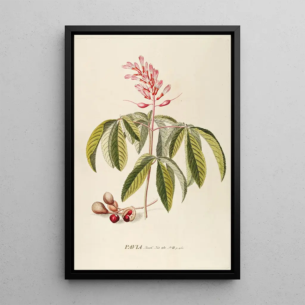 Pavia : an ode to flourishing nature The art print Pavia by Georg Dionysius Ehret immerses us in an unparalleled botanical universe. This piece, created with remarkable precision, highlights vibrant colors and striking details that capture the very essence of flora. The shades of green, yellow, and red blend harmoniously, creating an atmosphere that is both lively and soothing. The copper engraving technique used by Ehret allows each petal and leaf to be rendered with incredible accuracy, inviting viewers to a deep contemplation of natural beauty. Georg Dionysius Ehret: a pioneer of botanical illustration Georg Dionysius Ehret is an iconic figure of the 18th century, recognized for his major contributions to botanical illustration. Born in Germany, he was influenced by the scientific discoveries of his time and masterfully combined art and science in his works. His career led him to collaborate with renowned botanists, which enriched his understanding of plants and their representation. Ehret played a crucial role in disseminating botanical knowledge, making his works not only aesthetic but also educational. His baroque style, characterized by dynamic compositions and vibrant colors, has left a lasting mark on the history of botanical art. A decorative acquisition with multiple advantages The reproduction of the Pavia painting is a decorative piece that will enhance any space, whether a living room, office, or bedroom. Its printing quality guarantees fidelity to the original details, allowing appreciation of every nuance and stroke of the artwork. The aesthetic appeal of this canvas lies in its ability to bring a touch of nature and serenity to your interior. By choosing this reproduction, you opt for a decorative element that evokes the beauty of the natural world while elegantly and timelessly enriching your environment.
