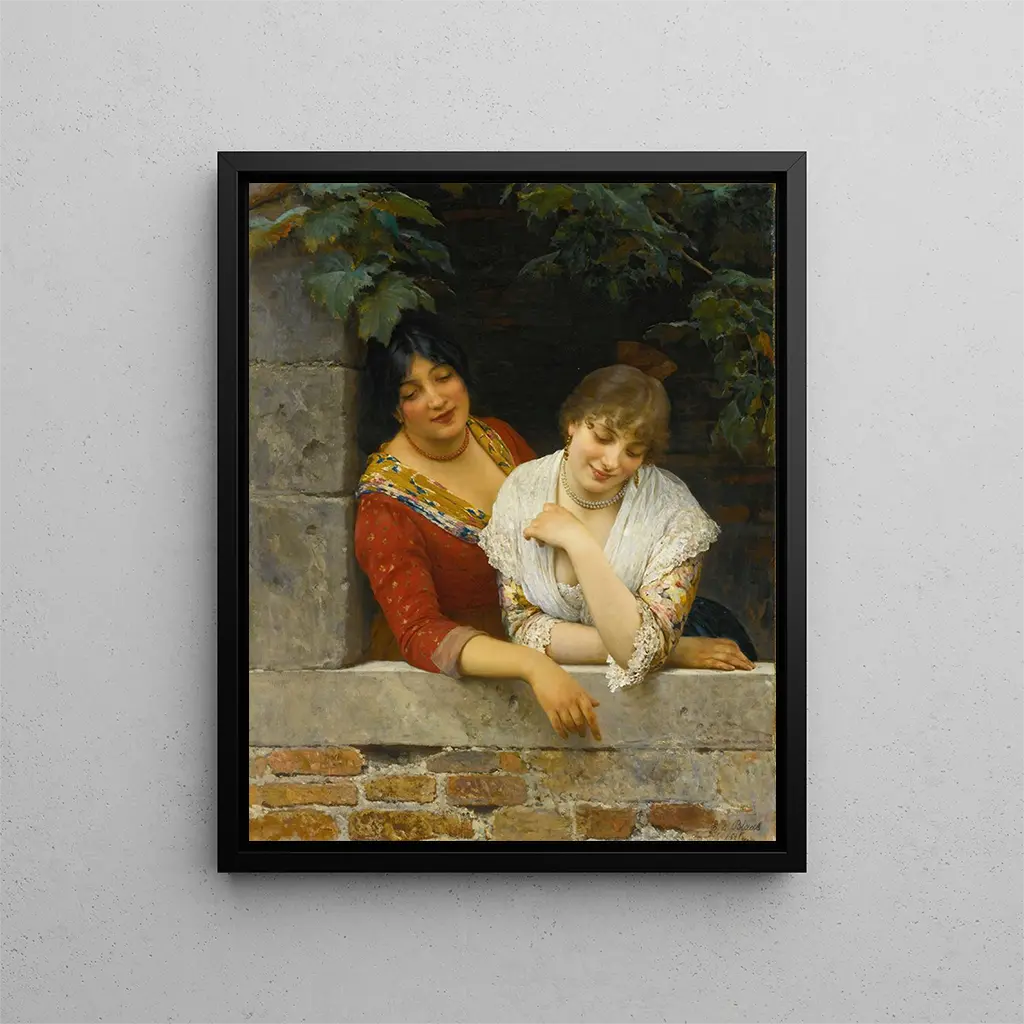Venice Balcony Art print - Eugen von Blaas – Captivating Introduction In the fascinating world of art, some works manage to capture the essence of an era, a culture, or even a universal sentiment. "Venice Balcony" by Eugen von Blaas is one of those creations that transports the viewer to the heart of the Serenissima, this city of a thousand reflections and stories. This canvas, imbued with light and life, invites us to contemplate the beauty of everyday scenes while celebrating the elegance of the characters depicted. Through this work, the artist offers us a window into a frozen moment, where time seems suspended, and where one can almost hear the whisper of Venetian canals. Style and uniqueness of the work Eugen von Blaas, master of realism, excels in depicting scenes of daily life, and "Venice Balcony" is a perfect example. The composition of the piece is carefully thought out, highlighting characters dressed in traditional costumes that evoke a bygone era. Light plays a leading role, illuminating faces and fabrics with an almost tangible softness. The meticulous details, from sumptuous drapes to subtle expressions, testify to exceptional craftsmanship. This work does not merely depict human figures; it tells a story, a delicate interaction between characters who seem to exchange knowing glances, as if sharing a secret in the heart of the city. This style, both realistic and poetic, makes this canvas a centerpiece that captivates with its ability to evoke deep emotions. The artist and his influence Eugen von Blaas, born in 1843 in Vienna, is an artist whose career is marked by an unceasing quest for beauty and harmony. Trained in the most prestigious academies, he develops a style that combines tradition and innovation. His attachment to Italian culture, particularly Venice, is evident in many works, where he captures the magic of this timeless city. Blaas draws inspiration from old masters while infusing his own vision, thus creating a bridge between the past and the present. His influence endures, and he is