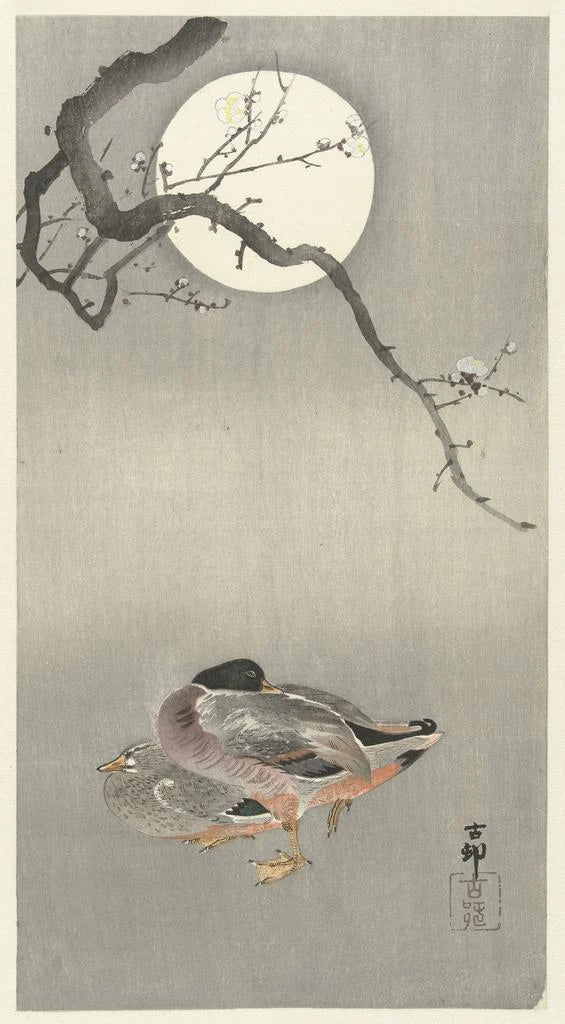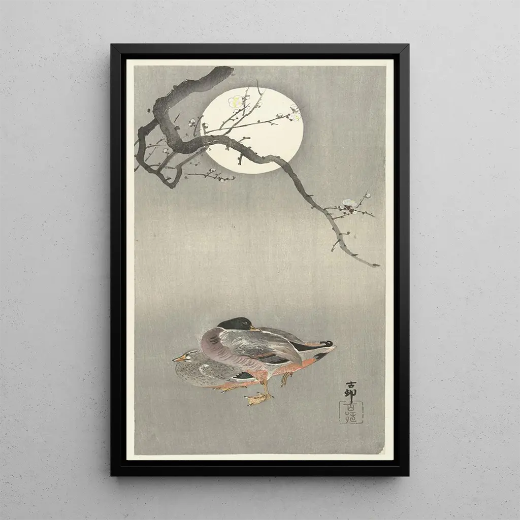Canards à la pleine lune : une harmonie nocturne Dans cette œuvre délicate, Ohara Koson capture la sérénité d'une nuit éclairée par la pleine lune. Les canards, silhouettes élégantes sur un lac tranquille, semblent flotter dans un monde de rêve. Les nuances de bleu et de noir s'entrelacent avec des touches d'or, créant une atmosphère apaisante et mystérieuse. La technique de l'art print sur papier, typique de l'ukiyo-e, permet de rendre les détails des plumes et des reflets d'eau avec une finesse remarquable. Cette reproduction de "Canards à la pleine lune" invite à la contemplation et à l'évasion, transportant le spectateur dans un univers de calme et de beauté. Ohara Koson : un maître de l'art print japonais Ohara Koson, actif durant la période Taisho (1912-1926), est reconnu pour ses œuvres qui célèbrent la nature et la vie quotidienne. Influencé par les traditions de l'ukiyo-e, il a su allier techniques anciennes et sensibilité moderne, se distinguant par son utilisation subtile des couleurs et des motifs. Koson a souvent représenté des oiseaux et des fleurs, capturant leur essence avec une précision poétique. Son travail, bien que moins connu que celui de ses contemporains, joue un rôle essentiel dans la préservation de l'art japonais. La reproduction de "Canards à la pleine lune" témoigne de son talent et de son engagement envers la beauté naturelle. Une acquisition décorative aux multiples atouts La reproduction de "Canards à la pleine lune" est un choix idéal pour embellir divers espaces de vie, que ce soit dans un salon, un bureau ou une chambre. Sa palette de couleurs apaisantes et son sujet évocateur apportent une touche de sérénité à n'importe quel intérieur. La qualité de l'impression garantit une fidélité remarquable aux détails de l'œuvre originale, permettant ainsi de profiter pleinement de l'esthétique de Koson. En ajoutant cette toile à votre décoration, vous créez une ambiance raffinée et contemplative, tout en célébrant l'héritage artistique japonais.
