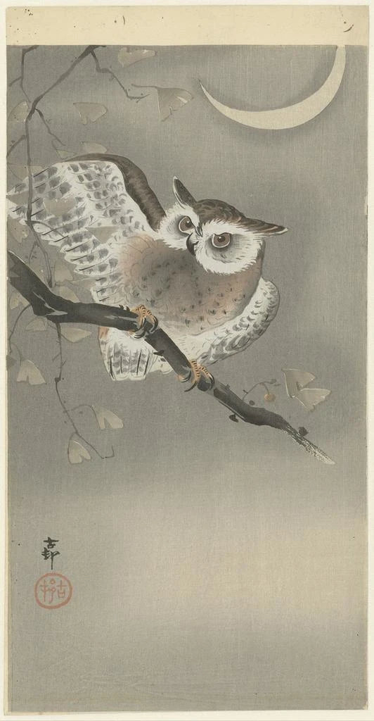 Art print | Medium-sized owl in a ginkgo tree - Ohara Koson