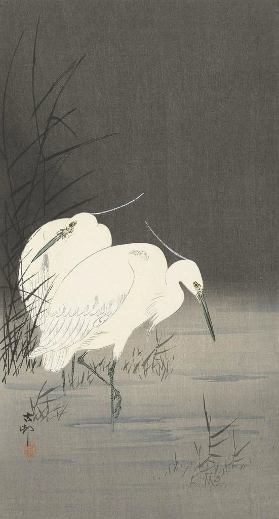 Ohara Koson, active in the early 20th century, is recognized as one of the masters of Japanese printmaking, particularly in the ukiyo-e style. His work is distinguished by a special attention to nature and wildlife, influenced by Japanese artistic traditions while incorporating modern elements. Koson captured the essence of his era, marked by social and cultural changes, while preserving the timeless beauty of nature. His creations, including "Two Egrets in the Reeds," are testimonies to his talent and commitment to art, continuing to inspire future generations.