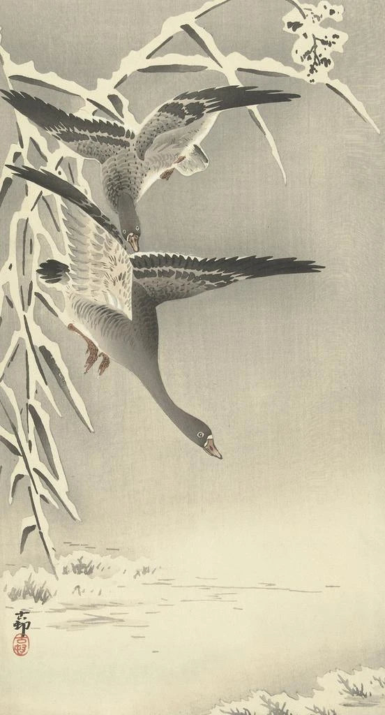 In this delicate art print, Ohara Koson transports us to the heart of a snowy landscape where two white-fronted geese stand peacefully. The composition is imbued with softness, with cool tones that evoke the tranquility of winter. The meticulous details of the feathers contrast with the pristine whiteness of the snow, creating a soothing atmosphere. The ukiyo-e technique, characteristic of Japanese art, captures the ephemeral beauty of nature while inviting the viewer to silent contemplation.