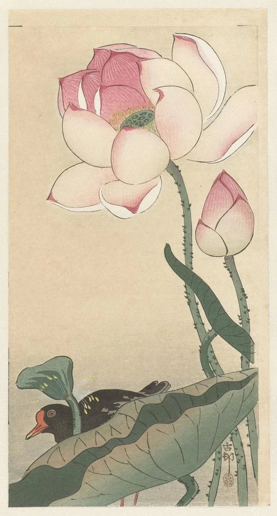 Art print | Gallinule with lotus flowers - Ohara Koson