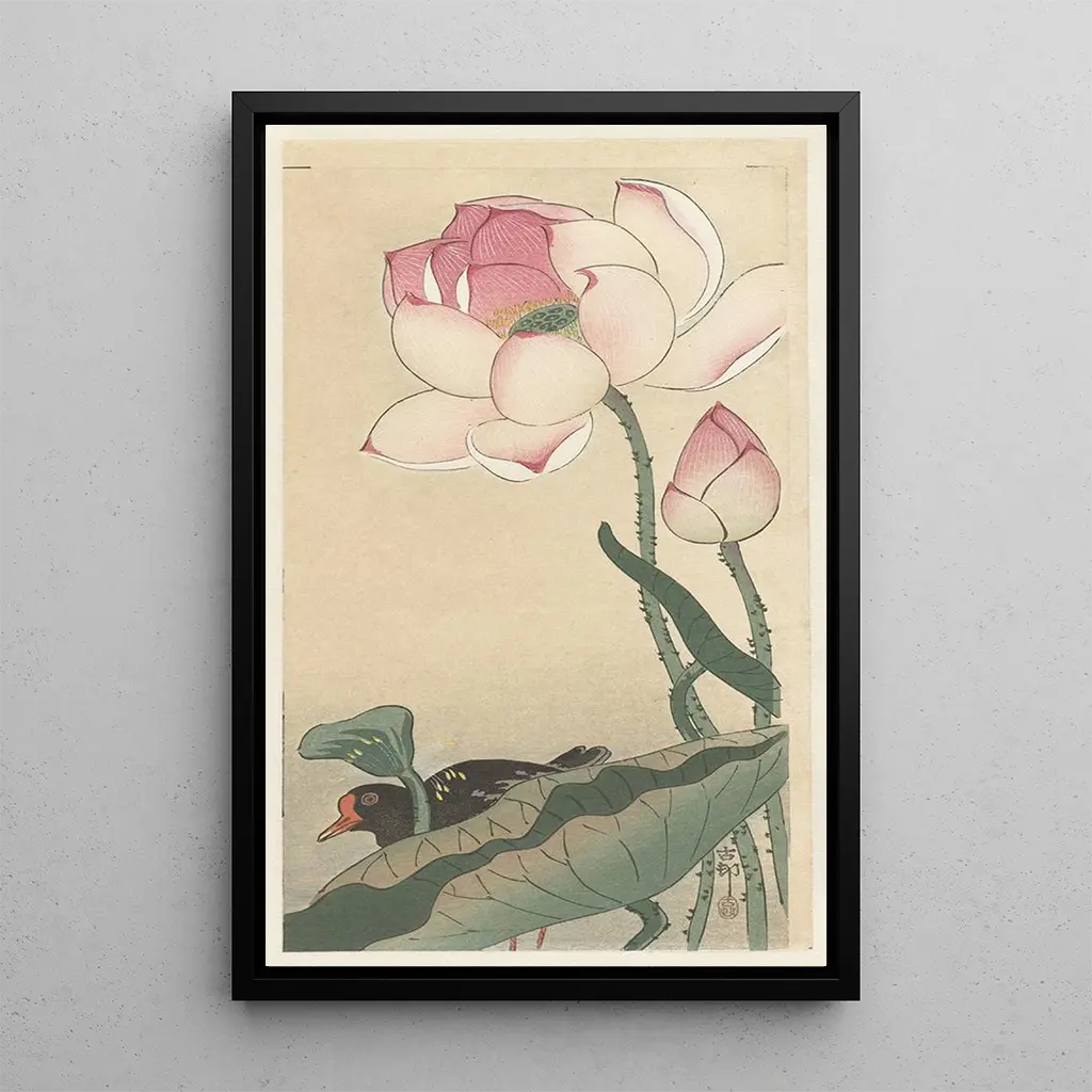 Gallinule with lotus flowers: an harmony between nature and serenity In this delicate art print, the gallinule stands majestically amidst blooming lotus flowers. The soft and soothing colors, ranging from subtle greens to pastel pinks, create an atmosphere of tranquility. The technique of woodblock print on paper, typical of Japanese art, captures the ephemeral beauty of nature. Every detail, from the bird's delicate feathers to the petals of the flowers, is rendered with remarkable precision, inviting the viewer to immerse themselves in a world of peace and contemplation. Ohara Koson: a master of Japanese woodblock print of the 20th century Ohara Koson, active in the early 20th century, is renowned for his prints that celebrate the beauty of nature and daily life. Influenced by ukiyo-e traditions, he skillfully combined modernity with ancestral techniques, creating timeless works. Koson particularly excelled in depicting birds and flowers, capturing their essence with unmatched finesse. His work is emblematic of Japanese art of that era, reflecting an aesthetic sensitivity that continues to inspire contemporary artists. A decorative art print with multiple assets The reproduction of "Gallinule with lotus flowers" is a perfect choice to enhance your interior, whether in a living room, office, or bedroom. Its print quality and fidelity to the original artwork guarantee a captivating visual rendering. This art print adds a touch of serenity and refinement, while eliciting admiration from your guests. By integrating this canvas into your decor, you create a harmonious space where nature is highlighted, while enjoying the aesthetic benefits of Japanese art.