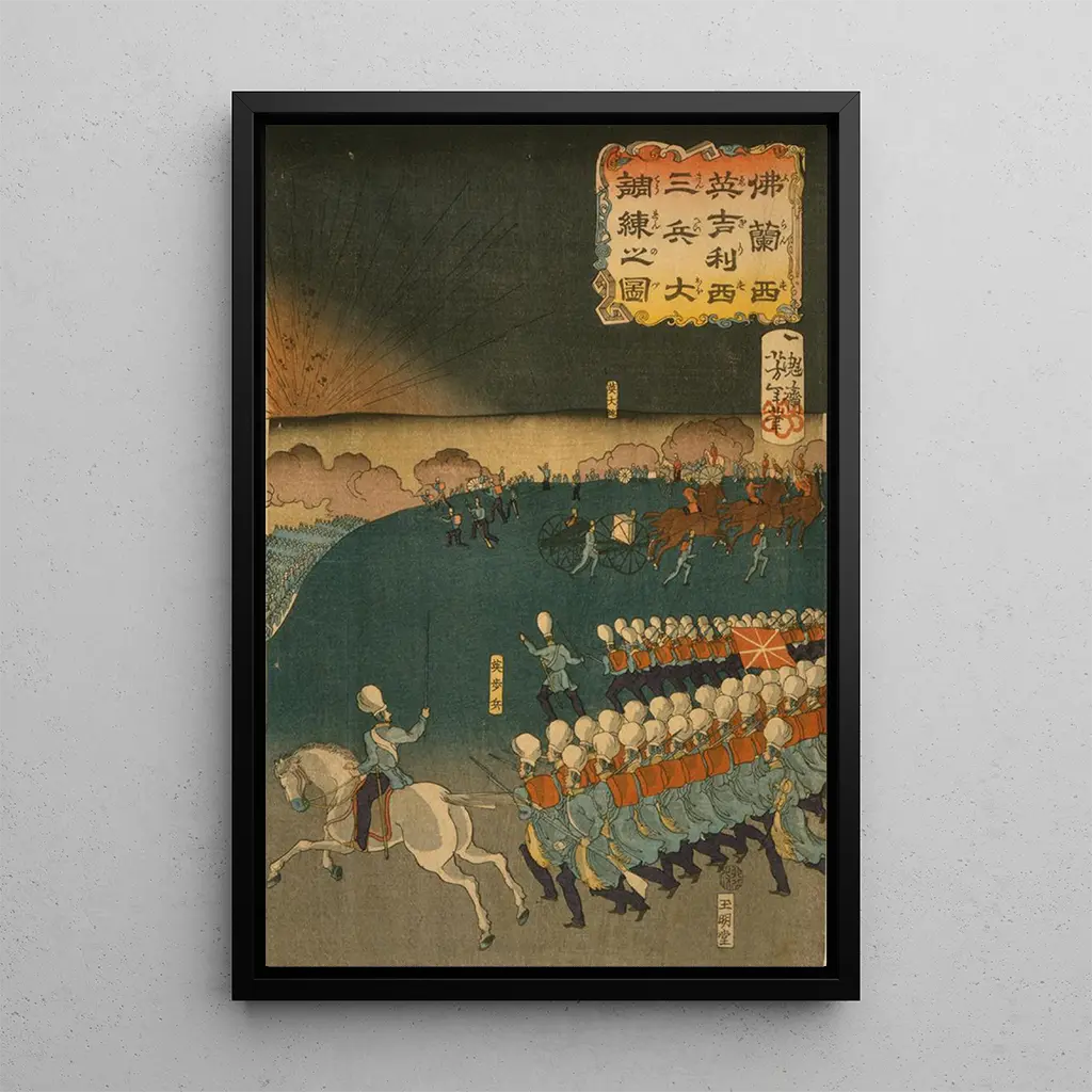 Tsukioka Yoshitoshi, an iconic figure of 19th-century Japanese art print, captured the spirit of his era through his works. Influenced by the social and political upheavals of the time, he integrated elements of Western culture while remaining true to his Japanese roots. His ability to fuse tradition and modernity made him an essential artist, whose impact is still felt today. The art print of "Furansu Igirisu sanpei daichsen no zu" is a perfect example of his talent, illustrating the curiosity and open-mindedness that characterize his oeuvre.