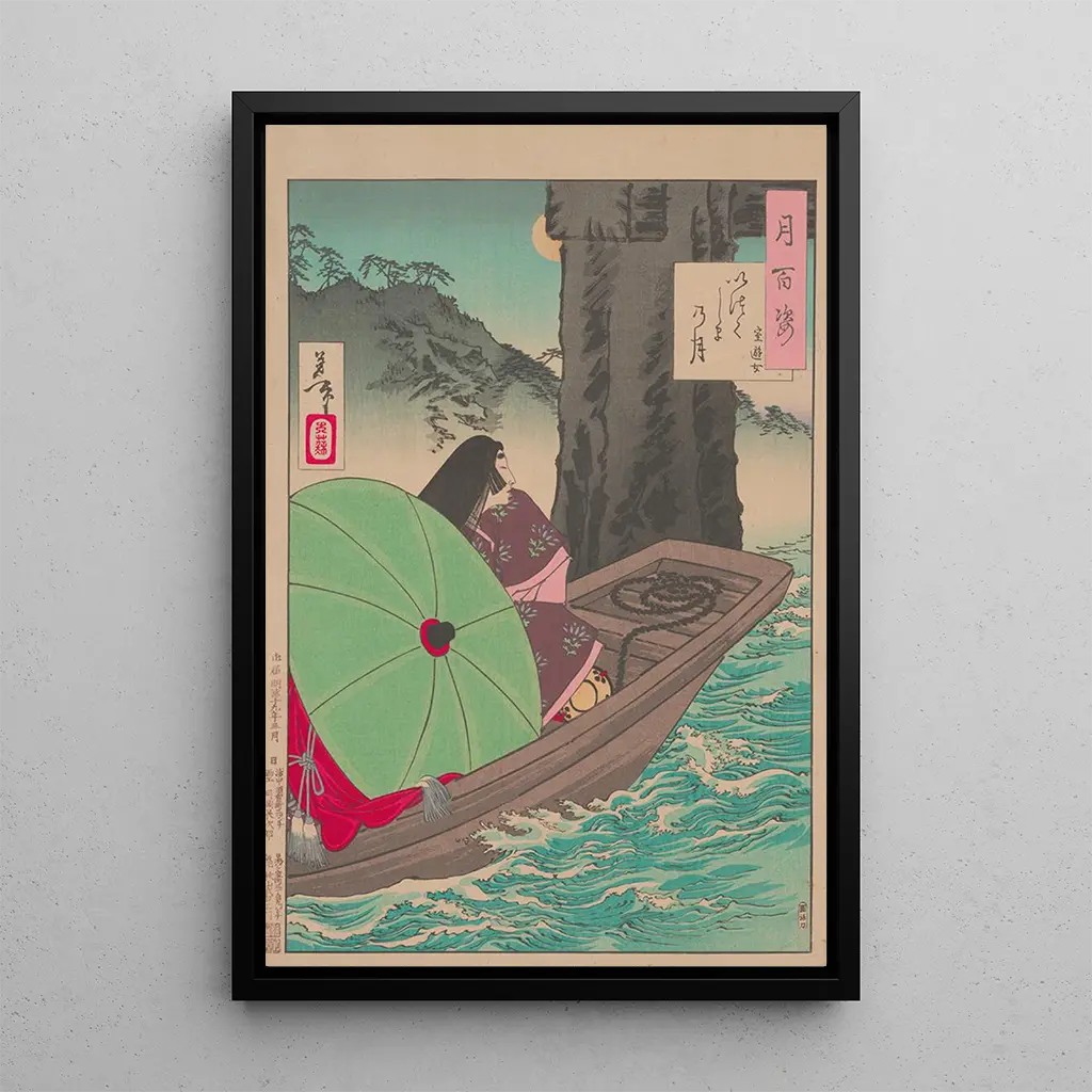 The art print of the painting Lune d'Itsukushima evokes a mystical atmosphere, where the moon reflects on the calm waters of Itsukushima Bay. The silvery and bluish hues create a striking contrast with the dark silhouettes of the torii and the mountains in the background. Tsukioka Yoshitoshi, master of Japanese ukiyo-e prints, uses delicate engraving techniques to capture the ephemeral beauty of nature. This artwork invites silent contemplation, where every detail seems to whisper ancient stories, paying homage to the spirituality of the Japanese landscape.
