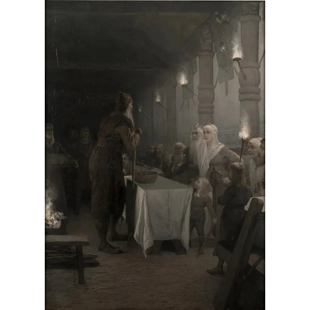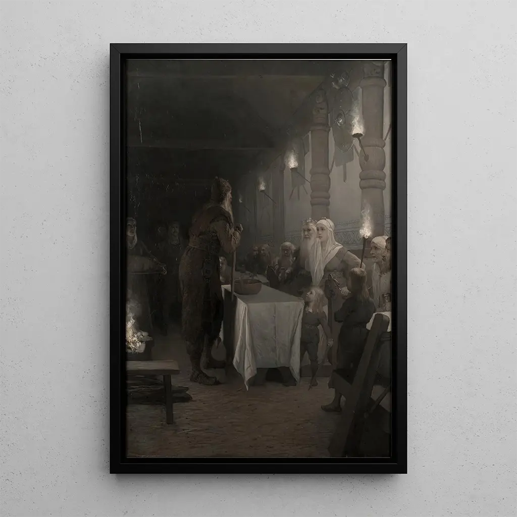 Frithiof visits King Ring: an epic journey into the heart of Nordic legends The art print of "Frithiof visits King Ring" by August Malmström immerses us in a mythical universe where heroism and beauty intertwine. This canvas, rich in detail, depicts Frithiof, a Viking hero, in a moment of dramatic tension. The vibrant colors and shades of green and blue evoke Scandinavian landscapes, while Malmström's technique, both realistic and romantic, creates a captivating atmosphere. The expressions of the characters and the natural elements surrounding them add narrative depth, inviting the viewer to delve into this ancient legend. August Malmström: a master of Swedish romanticism August Malmström, born in 1829, is an iconic Swedish painter of the romantic movement. Influenced by Nordic tales and legends, he captured the essence of Scandinavian culture through his works. His career spans the 19th century, a period marked by a renewed interest in folklore and national history in Sweden. Malmström was also an influential teacher, sharing his passion for art with many students. His paintings, such as the art print of "Frithiof visits King Ring," are not only visual representations but also stories that evoke pride and cultural identity of his country. A decorative piece with multiple virtues The art print of "Frithiof visits King Ring" is a decorative item that will enhance any interior, whether in a living room, office, or bedroom. Its printing quality guarantees remarkable fidelity to the details of the original work, allowing full appreciation of Malmström's talent. The aesthetic appeal of this canvas lies in its ability to evoke emotions and tell a story, making it an excellent choice for those seeking to add a touch of elegance and culture to their living space. By choosing this art print, you invite a piece of Swedish artistic heritage into your daily life.