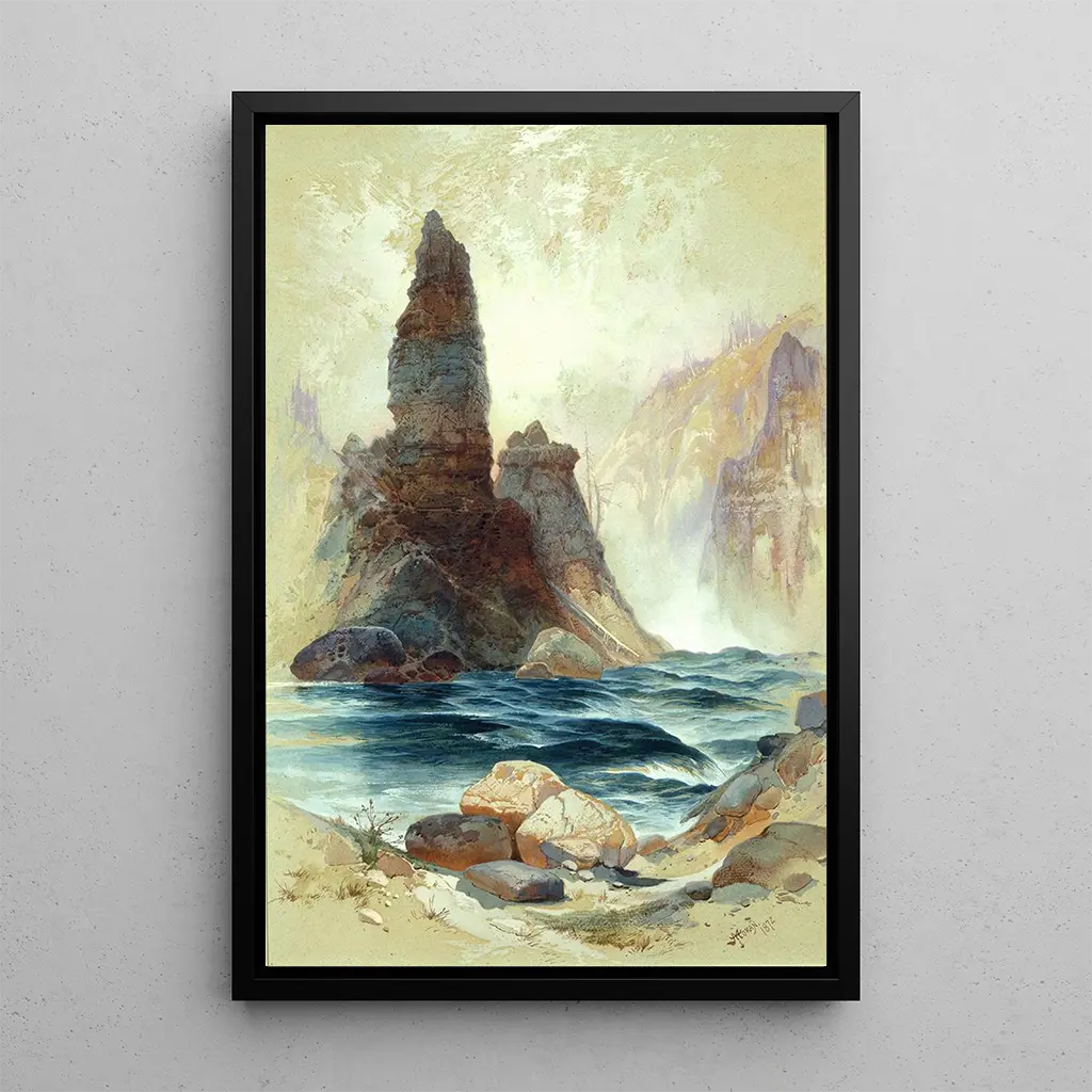 Thomas Moran, an influential 19th-century artist, captured the grandeur of American landscapes through his works. Born in England, he emigrated to the United States where he was deeply inspired by the country's spectacular scenery, especially national parks. His style, combining romanticism and realism, helped shape the perception of American landscapes in art. "Above Yellowstone Falls" perfectly illustrates his talent for representing nature with emotional intensity, while playing a key role in raising awareness about the preservation of these natural treasures.