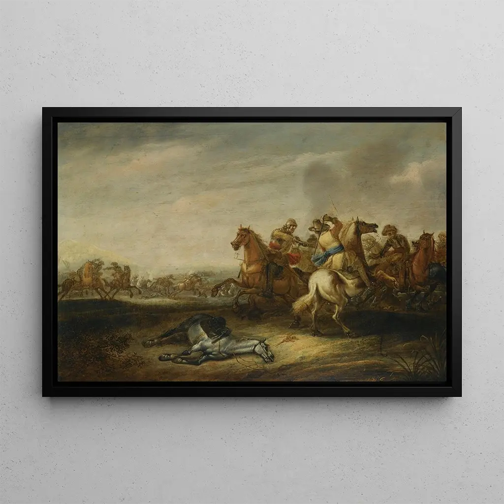 In "A Cavalry Battle," Abraham van der Hoef captures the intensity of a military confrontation through a dynamic composition. The horses, driven by palpable energy, blend with the silhouettes of the riders, creating a whirlwind of motion. The vivid colors, ranging from deep reds to bright blues, enhance the dramatic atmosphere of the scene. The artist's technique, which skillfully combines chiaroscuro, brings the characters and armor details to life, immersing the viewer in the frantic action of the battle.