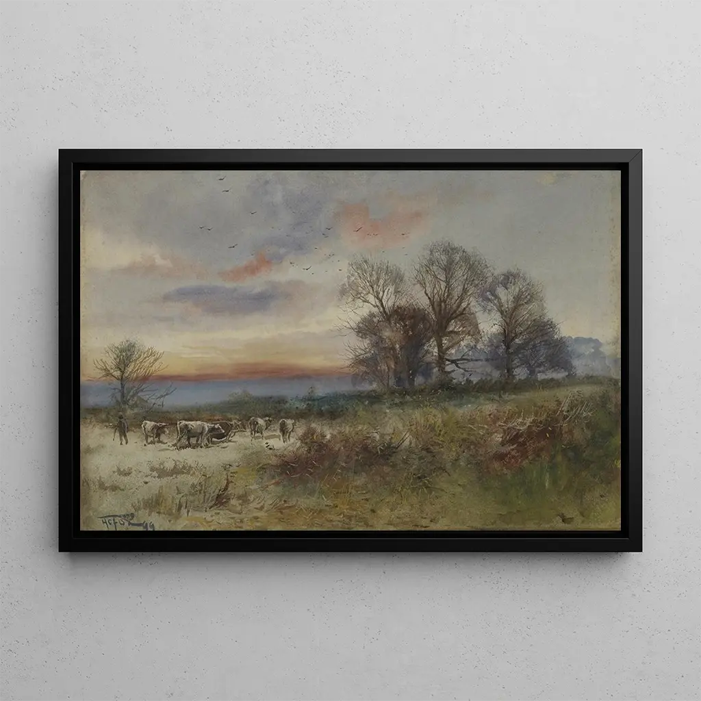 In Claygate, Surrey: a nostalgic look at rural life The painting In Claygate, Surrey by Sir William Fox depicts a bucolic scene filled with softness and tranquility. The warm, earthy colors, combined with a golden light, create a welcoming and nostalgic atmosphere. The composition, highlighting lush landscapes and picturesque houses, transports the viewer to a moment of serenity, far from urban hustle. The oil painting technique, mastered by the artist, gives the work a rich and lively texture, making every detail almost tangible. Sir William Fox: a witness to Victorian life Sir William Fox, a British painter of the 19th century, is known for his representations of rural life and nature. His work is part of the Victorian artistic movement, which emphasized the beauty of landscapes and the simplicity of everyday life. Influenced by the Impressionists, Fox captured the light and atmosphere of his subjects with a unique sensitivity. His career, marked by a constant exploration of rural themes, made him a respected artist whose works continue to inspire art enthusiasts. A decorative piece with multiple virtues The art print of the painting In Claygate, Surrey is a decorative piece that fits perfectly into various interior styles, whether a cozy living room or an inspiring office. Its idyllic depiction of the English countryside adds a touch of charm and tranquility to your space. The quality of the art print ensures exceptional fidelity to the original work, allowing you to enjoy every nuance of color and detail. By choosing this canvas, you add not only a piece of art to your decor but also a piece of history and culture that will enrich your daily life.