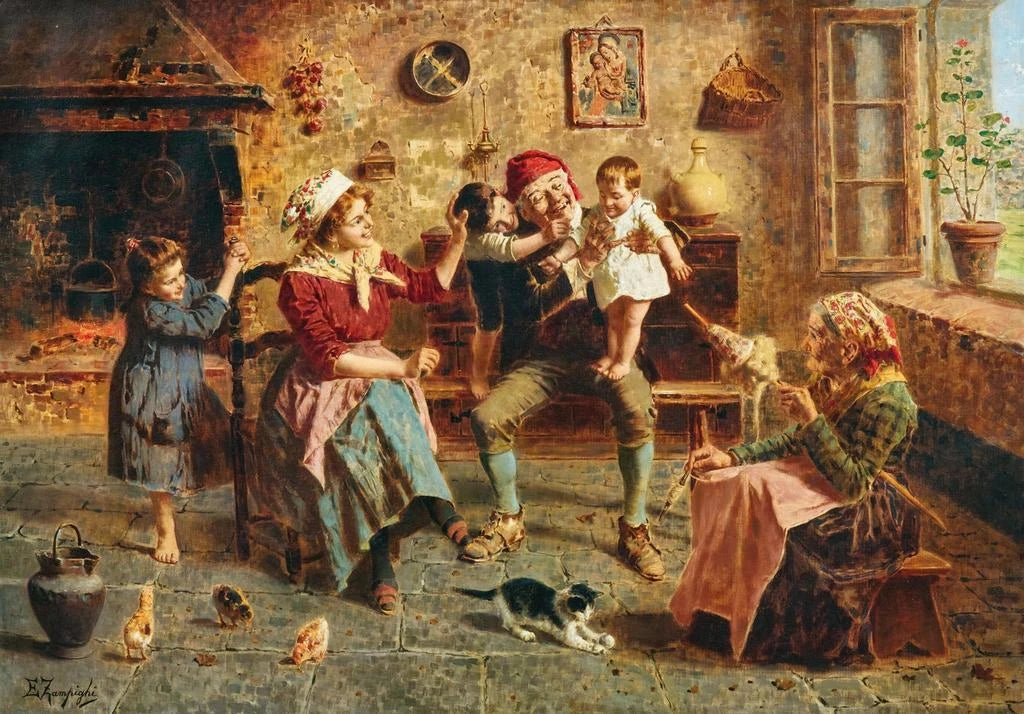 Eugenio Zampighi, an Italian painter of the 19th century, is renowned for his works that celebrate daily life and human relationships. Influenced by the realist movement, he dedicated himself to depicting scenes of family life and moments of conviviality. Zampighi was able to capture the essence of human interactions, earning him an important place in the art of his time. His paintings, often tinged with nostalgia, reflect an ideal of harmonious and warm life, making him a beloved artist both by his contemporaries and future generations.