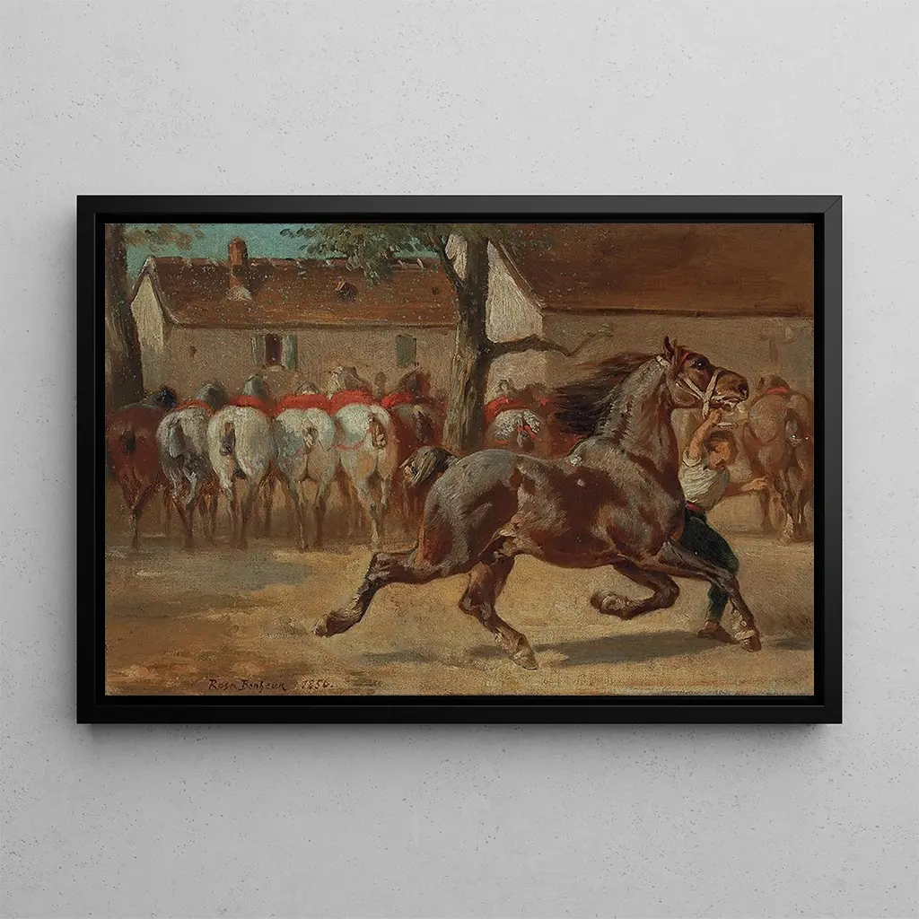 A trotting horse: an ode to equestrian power The canvas "A Trotting Horse" by Rosa Bonheur brilliantly captures the majesty and grace of the horse in motion. The earthy colors and shades of brown blend harmoniously to create a lively and dynamic atmosphere. Bonheur's realistic technique, marked by meticulous details, allows you to feel the strength and energy of the animal. Every muscle, every movement is rendered with such precision that you could almost hear the sound of hooves hitting the ground. This artwork invites deep contemplation, revealing not only the beauty of the horse but also the love that the artist has for nature. Rosa Bonheur: pioneer of animal painting Rosa Bonheur, an iconic figure of the 19th century, is recognized for her exceptional talent in depicting animals. Born in 1822, she was influenced by realism and naturalism, movements that advocate for careful observation of nature. Her work stands out for an almost scientific approach, where every detail is carefully observed and reproduced. Bonheur defied the conventions of her time, becoming one of the first women to be recognized in the art world, and her legacy endures through her works that celebrate the beauty of the animal kingdom. A decorative acquisition with multiple assets The art print of "A Trotting Horse" is an ideal decorative choice to enhance the ambiance of your living room, office, or bedroom. Its printing quality guarantees remarkable fidelity to the colors and details of the original artwork, adding a touch of elegance and dynamism to your space. This piece attracts the eye and sparks conversations, while adding a note of sophistication to your interior decor. By choosing this canvas, you opt for a piece that combines artistic beauty and timeless charm, perfect for art and nature lovers.