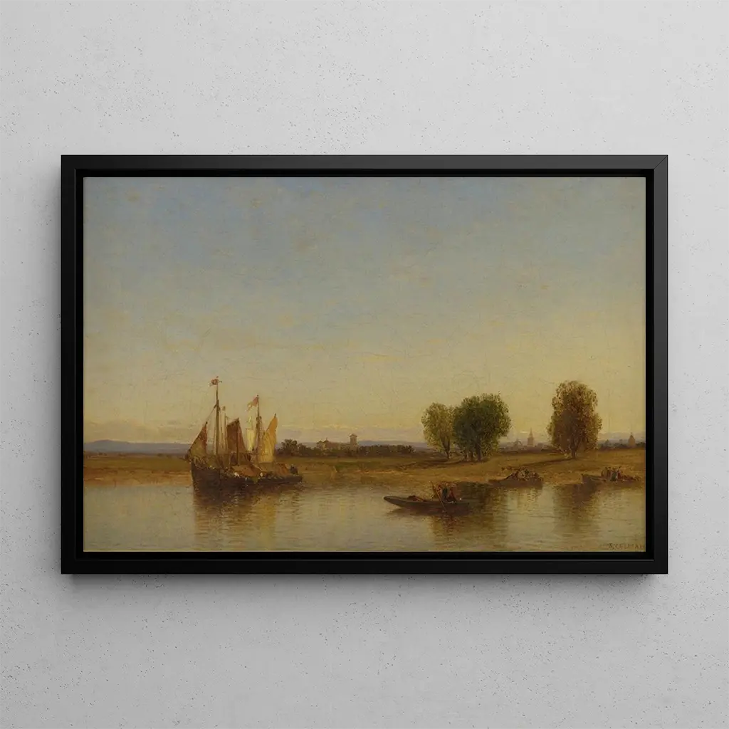 The art print "A River in Italy" by Samuel Colman evokes a peaceful scene, where nature unfolds in all its splendor. The soft and luminous colors, ranging from vibrant greens to calming blues, create an atmosphere of tranquility. Colman's technique, which skillfully blends oil painting with touches of light, brings this idyllic landscape to life. The reflections in the water, majestic trees, and rolling hills invite meditative contemplation, transporting the viewer on a visual journey into the heart of Italy.