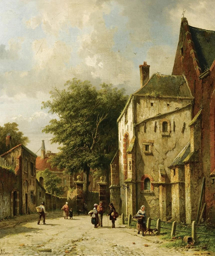 Discover the captivating atmosphere of 19th-century Netherlands through the art print of "A Street Scene in a Dutch Town" by Adrianus Eversen. This iconic piece transports viewers to the heart of a vibrant urban life, where cobbled alleys and colorful facades tell forgotten stories. The soft daylight reflects on surfaces, creating a play of shadows and light that evokes nostalgia and tranquility. Every detail, from the characters to architectural elements, seems to capture a fraction of everyday reality, inviting prolonged contemplation.