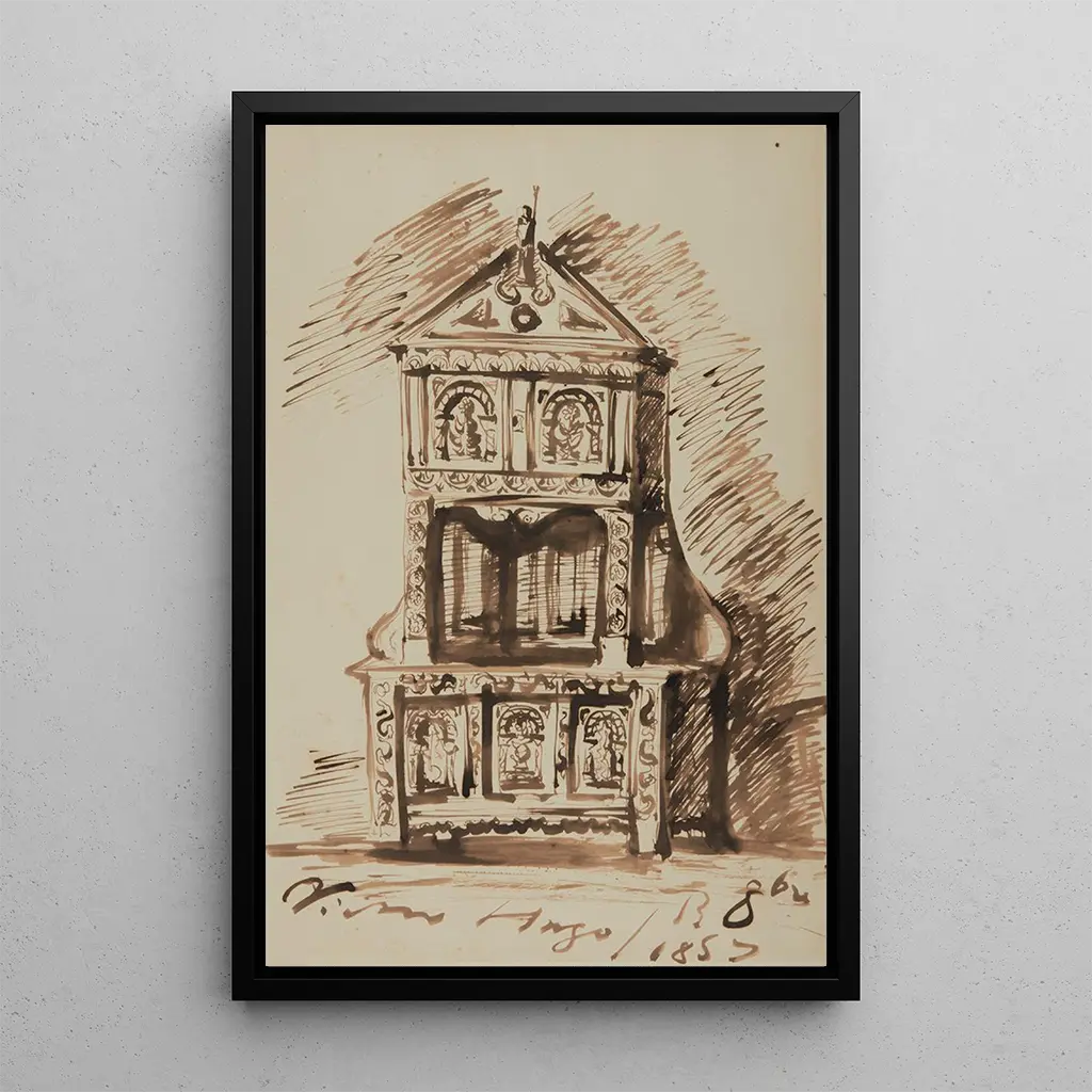 A sideboard: an ode to craftsmanship and nature The art print "A sideboard" by Victor Hugo immerses us in a universe where craftsmanship meets nature. The composition, rich in detail, highlights a carved wooden piece of furniture, adorned with delicate floral motifs. The warm colors, ranging from deep browns to soft greens, create a welcoming and cozy atmosphere. Hugo's painting technique, blending realism and romanticism, brings this everyday object to life, transforming it into a true work of art. Every brushstroke seems to tell a story, inviting the viewer to linger on the beauty of simple things. Victor Hugo: a master of French romanticism Victor Hugo, a renowned 19th-century writer and poet, is also recognized for his talents as a painter. Influenced by the romantic movement, he captured the essence of his era through his artworks. Although mainly known for his novels such as "Les Misérables," Hugo explored painting as a complementary means of expression. His style, imbued with passion and emotion, reflects the tumult of his time, while celebrating the beauty of nature and craftsmanship. "A sideboard" fits into this quest for beauty, demonstrating the importance of art in everyday life. A decorative acquisition with multiple advantages The art print of the painting "A sideboard" by Victor Hugo is an ideal decorative piece to enhance your interior. Whether in a living room, office, or bedroom, this canvas adds a touch of elegance and warmth. Its reproduction quality guarantees fidelity to the original details, allowing you to fully enjoy the unique atmosphere of the artwork. With its aesthetic appeal, it will attract art lovers and literature enthusiasts alike, while harmoniously fitting into various decorating styles.