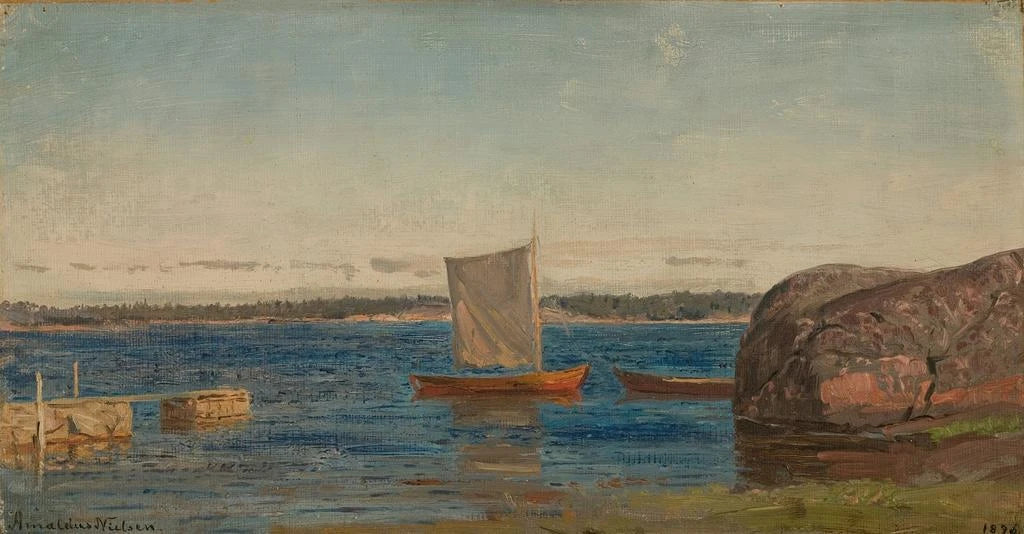 De Hvaler: a maritime scene imbued with serenity The art print De Hvaler by Amaldus Nielsen captures the tranquil beauty of the Norwegian coastal landscapes. This canvas depicts a panoramic view of the Hvaler Islands, where the sea harmoniously blends with the land. The shades of blue and green gently merge, evoking a peaceful and contemplative atmosphere. Nielsen's technique, characterized by fluid brushstrokes and meticulous attention to detail, allows you to feel the sea breeze and the sunlight's sparkle on the water. Every element of the composition, from the rocks to the sails of the boats, contributes to creating an invitation to escape. Amaldus Nielsen: a master of Scandinavian landscape Amaldus Nielsen, active in the 19th century, is renowned for his marine landscapes and representations of Norwegian nature. Influenced by Romanticism, his work reflects a deep admiration for the wild beauty of his homeland. Nielsen was able to capture the essence of light and color, earning him an important place in Scandinavian art history. His travels across Norway enriched his style, allowing him to explore various techniques and perspectives. The art print De Hvaler bears witness to his exceptional talent and his commitment to authentic landscape representation. A decorative acquisition with multiple benefits The art print De Hvaler is an ideal decorative piece to enhance your living room, office, or bedroom. Its printing quality guarantees remarkable fidelity to the colors and details of the original work, adding a touch of elegance to your interior. This painting, with its serene ambiance, invites relaxation and contemplation, making each glance a moment of peace. By incorporating this canvas into your decor, you add not only a piece of art but also an open window to the natural beauty of Norway, enriching your living space.