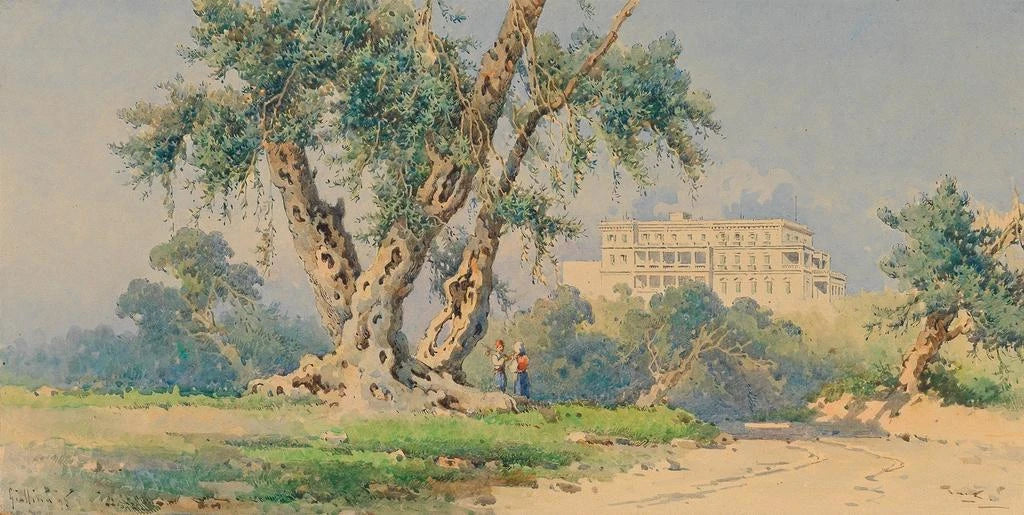 Achilleion, an iconic work by Angelos Giallinas, transports us into a fascinating mythological universe. This canvas, rich in colors and details, depicts the famous palace of Achilles, a place full of history and legend. The vibrant shades of blue and green evoke the Aegean Sea, while the architectural elements testify to timeless grandeur. Giallinas's technique, blending realism and romanticism, creates an atmosphere that is both majestic and melancholic. Every element of the composition seems to tell the epic of Achilles, hero of Greek mythology, inviting contemplation of his exploits.