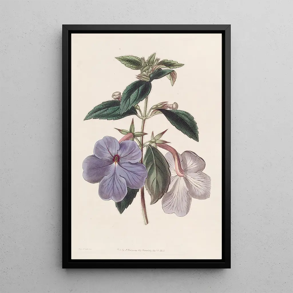 The art print Achimènes with long flowers transports us to a lush garden, where the flowers bloom with grace and radiance. This work by Sydenham Edwards highlights the delicate beauty of this plant, with vibrant colors that illuminate the canvas. The shades of violet and yellow combine to create a striking contrast, while the precise details of the petals and leaves reveal exceptional craftsmanship. The atmosphere conveyed by this piece is both joyful and soothing, inviting a peaceful contemplation of nature.