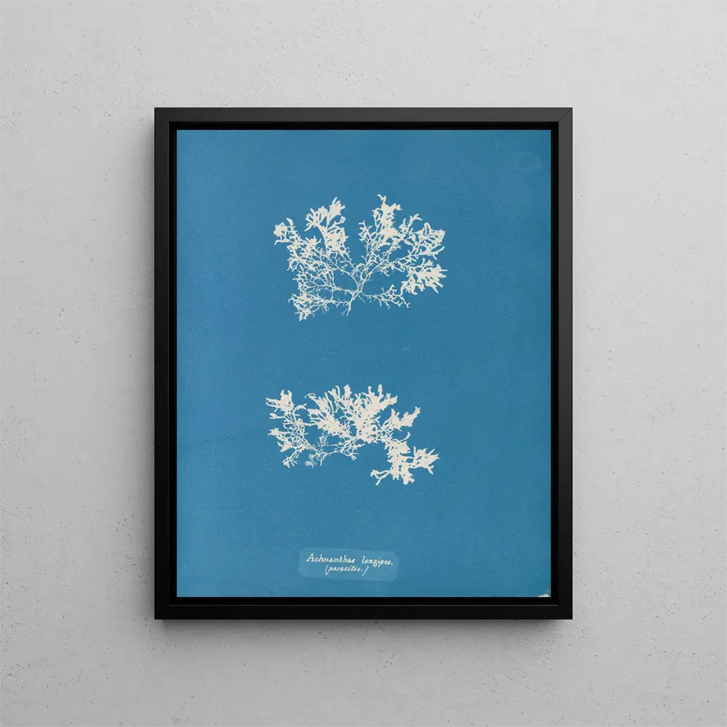 Anna Atkins' work "Achnanthes longipes parasite" is much more than a simple botanical representation; it is a true celebration of natural beauty and science. Created in the 19th century, this iconic piece embodies the harmonious marriage between art and science, a trend that emerged during that period. Anna Atkins, a pioneer of photography and botanist, captured the delicacy of algae through innovative techniques. Her cyanotype method, which uses sunlight to print images, gives her works an ethereal, almost magical quality. The art print of "Achnanthes longipes parasite" allows admirers to immerse themselves in this fascinating universe, where nature and art meet with rare elegance. Style and uniqueness of the work The piece stands out for its unique approach to representing algae, combining scientific precision with artistic sensitivity. The meticulous details of the Achnanthes, rendered with remarkable finesse, reveal the complexity of these microscopic organisms. The color palette, ranging from deep blues to shades of green, evokes a calming atmosphere while highlighting the transparency and lightness of the subjects. Each cyanotype print is unique, as it depends on the exposure conditions to light, which gives each piece a personal and inimitable dimension. This singularity makes "Achnanthes longipes parasite" an essential piece for those who appreciate the harmony between nature and art, while also offering a reflection on the fragility of our ecosystem. The artist and her influence Anna Atkins, often considered the first female photographer, played a decisive role in the evolution of botanical photography. Her work paved the way for many artists and scientists, demonstrating that art could be a powerful tool for studying and documenting nature. By integrating photography into her creative process, Atkins not only highlighted the beauty of algae but also contributed to the recognition of photography as a full-fledged art form. Her influence endures today, inspiring generations of artists who continue to explore the links between science and art.