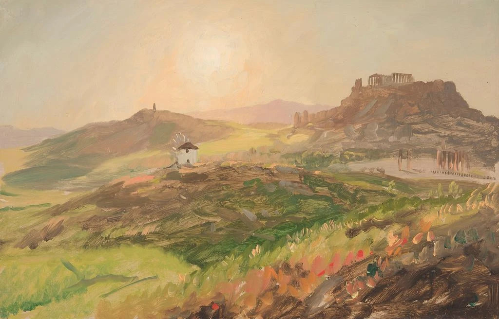 Frederic Edwin Church, an iconic figure of the Hudson River School movement, was able to capture the beauty of American landscapes and beyond. Active in the 19th century, he was influenced by travels in Europe and South America, incorporating elements of these cultures into his works. Church played a crucial role in the evolution of Romantic landscape art, blending realism and idealization. His ability to depict light and atmosphere made him a respected artist, whose impact on landscape art endures to this day. "Vue de l'Acropole d'Athènes" reflects his interest in historic sites and their portrayal within a sublime natural setting.
