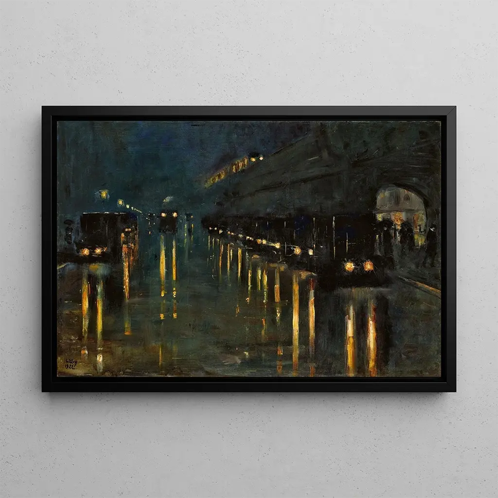 Lesser Ury, a German painter active at the end of the 19th and beginning of the 20th century, is renowned for his depictions of urban life, particularly in Berlin. Influenced by Impressionism, he captured the nuances of light and atmosphere in his works. Ury often explored themes of solitude and anonymity in the modern city, which is reflected in "Aerial metro station Blowstraße at night." His unique style and ability to evoke emotions through everyday scenes make him an important figure in modern art, whose legacy continues to inspire contemporary artists.