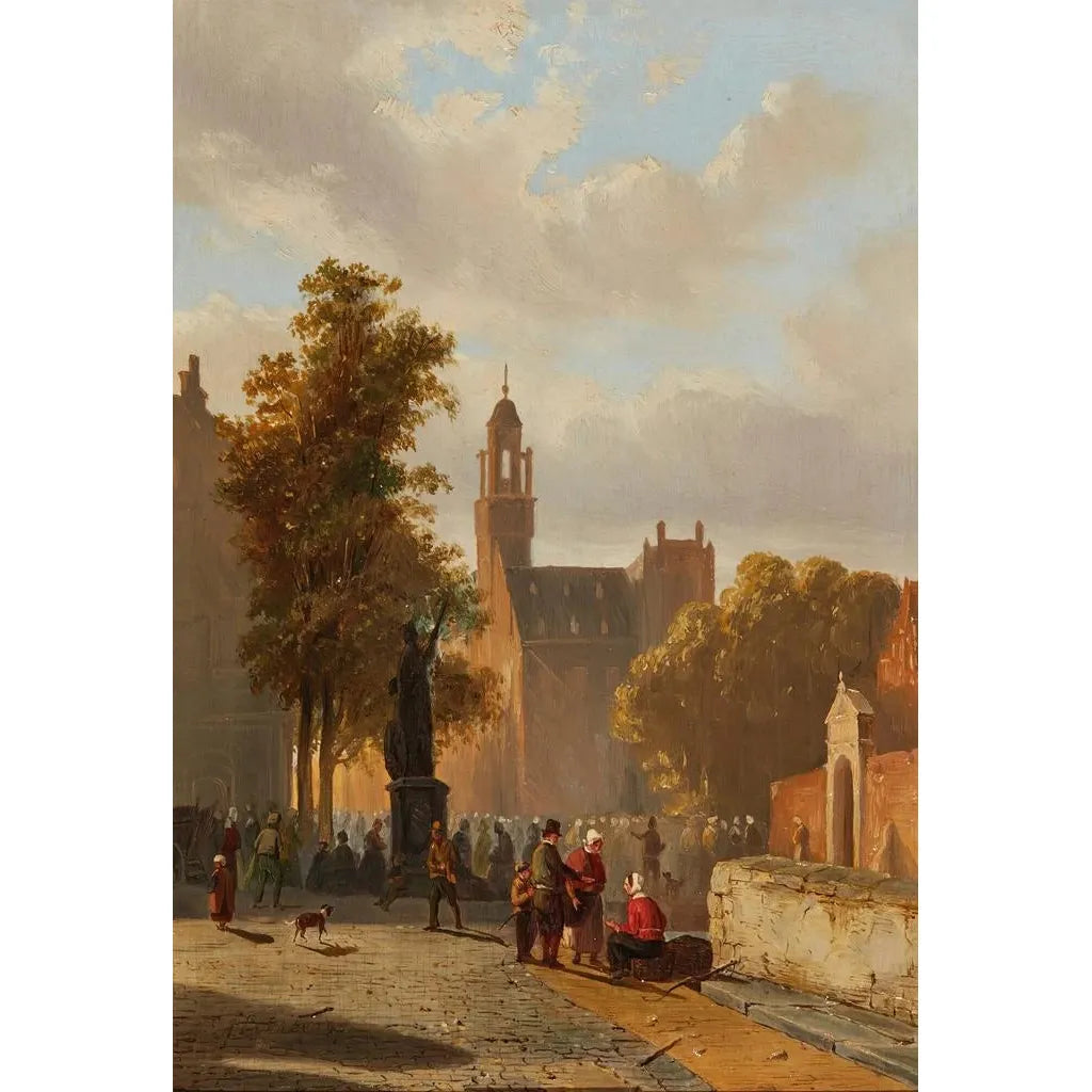 In this art print by Adrianus Eversen, the painting "After the church" immerses us in a serene and contemplative atmosphere. The characters, dressed in period clothing, slowly disperse after the religious service, creating a dynamic of everyday life. The soft and warm colors, ranging from earthy browns to soothing greens, evoke natural light bathing the scene. The artist's technique, characterized by delicate brushstrokes, brings to life the architectural details of the church and the surrounding houses, while conveying a sense of tranquility and conviviality.