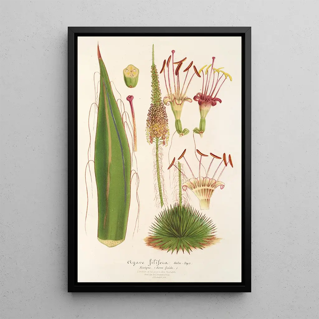 The art print "Agave filifera" by Charles Antoine Lemaire is a celebration of nature, where the delicate lines of the leaves blend with shades of vibrant green. The composition evokes a subtle harmony between the geometric precision of the plant and the fluidity of the light playing over its contours. Lemaire, a master botanist, employs engraving techniques that reveal not only the aesthetic beauty of the agave but also its complex structure. The atmosphere emanating from this art print is both serene and captivating, inviting the viewer to delve into the fascinating world of succulent plants.
