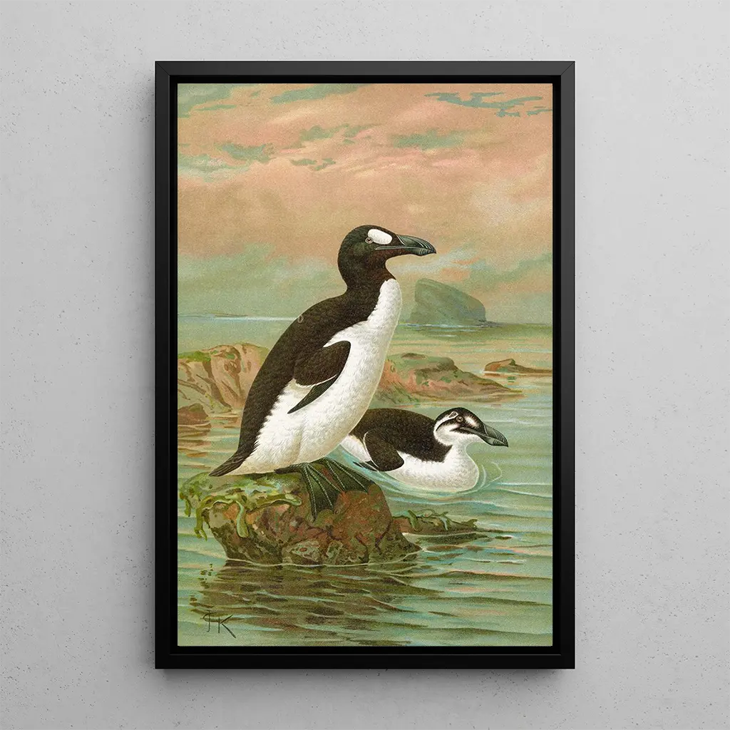 Alca impennis L Riesenalk : a timeless charm extinct bird art print The art print Alca impennis L Riesenalk, by Johann Friedrich Naumann, evokes the majesty of a bird now extinct. With delicate colors, ranging from deep black to bright white, this canvas captures the very essence of nature. The watercolor technique, used with remarkable precision, brings this marine bird to life, whose gaze seems to pierce the viewer. The atmosphere of the piece is tinged with melancholy, reminding us of the fragility of biodiversity and the importance of species conservation. Johann Friedrich Naumann : a pioneer of artistic ornithology Johann Friedrich Naumann, a 19th-century naturalist and artist, played a key role in ornithological illustration. Influenced by the naturalist movements of his time, he mastered the art-science blend to capture the beauty of birds. His career, marked by travels across Europe, allowed him to observe and draw numerous species. Naumann is recognized for his contribution to ornithological knowledge, and his works, like this art print, are valuable testimonies of the avian fauna of his era. A decorative acquisition with multiple assets The art print Alca impennis L Riesenalk is an ideal decorative piece to enhance your interior, whether in a living room, office, or bedroom. Its print quality and fidelity to details make it a captivating artwork that draws the eye. The aesthetic appeal of this canvas lies in its ability to spark conversations about nature and conservation. By incorporating this piece into your decor, you add a touch of elegance and reflection on our environment.