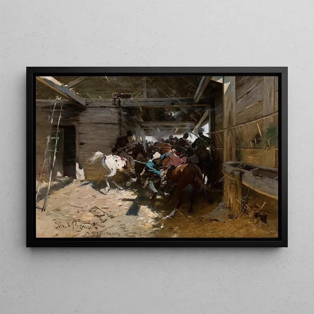 The art print "Alert" by Józef Brandt immerses us in a vibrant scene, where the palpable tension between the characters and their environment is accentuated by warm colors and meticulous details. The dynamic composition, centered on an alert rider, evokes a sense of urgency and movement. The shades of brown and green, mixed with touches of red, create an atmosphere that is both dramatic and captivating. Brandt's technique, blending realism with a certain poetry, invites the viewer to immerse themselves in this historical scene, where each element tells a story.