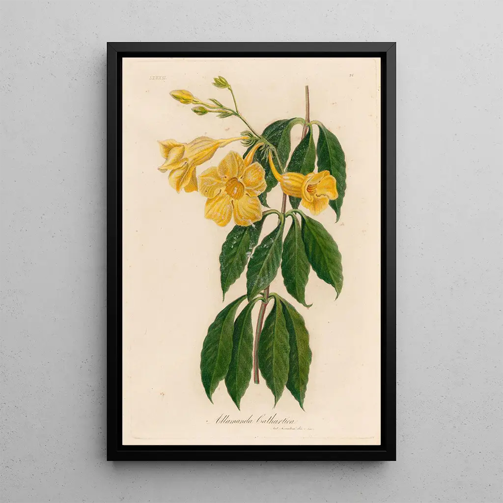 Allamanda cathartica: a tribute to tropical beauty The art print of Allamanda cathartica, created by Gaetano Savi, is a true homage to the splendor of tropical flowers. With its vibrant yellow petals and delicate shapes, this piece captures the eye and evokes the warmth of sunny climates. Savi's technique, blending watercolor and botanical precision, allows for each detail to be rendered with remarkable finesse. The atmosphere emanating from this canvas is both joyful and soothing, inviting contemplation of natural beauty. Each flower seems to vibrate with life, creating a connection between art and nature. Gaetano Savi: a master of botanical illustration Gaetano Savi, active in the 19th century, is renowned for his contributions to botanical illustration, a field where he combined scientific rigor with artistic sensitivity. Influenced by the botanical discoveries of his time, Savi dedicated his career to immortalizing the beauty of plants through his works. His meticulous approach and attention to detail make him an essential figure in the world of botanical art. Savi's works, such as the art print of Allamanda cathartica, reflect wonder at nature and the importance of floral documentation during a period when botany was flourishing. A decorative acquisition with multiple assets The art print of Allamanda cathartica is a decorative piece that will enhance your interior, whether it is a living room, office, or bedroom. Its printing quality ensures exceptional fidelity to the vibrant colors and intricate details of the original work. By integrating this art print into your decor, you bring a touch of freshness and vitality to your space, while paying tribute to Gaetano Savi's art. This piece is not only an aesthetic choice but also a celebration of natural beauty that enriches our daily lives.