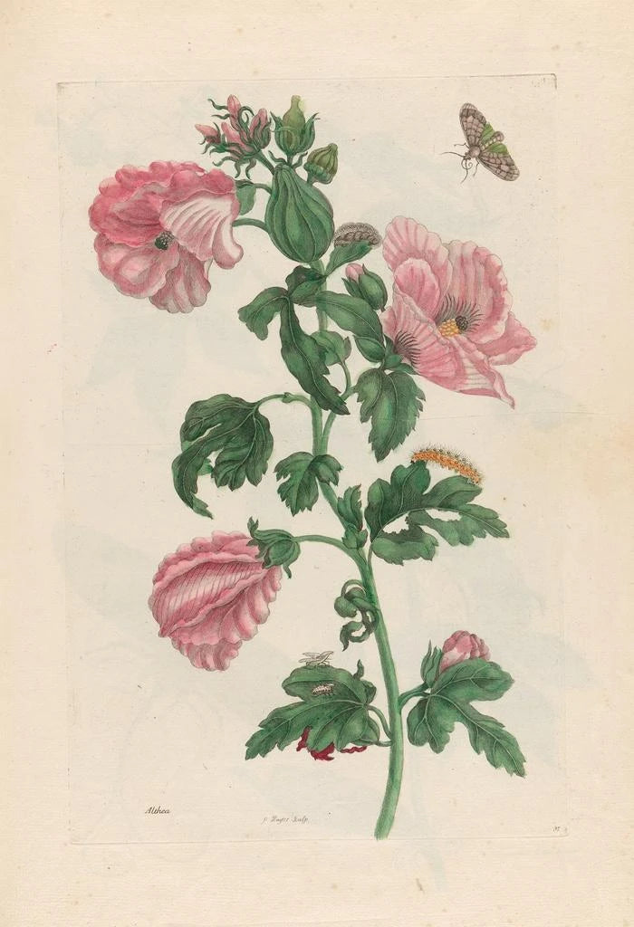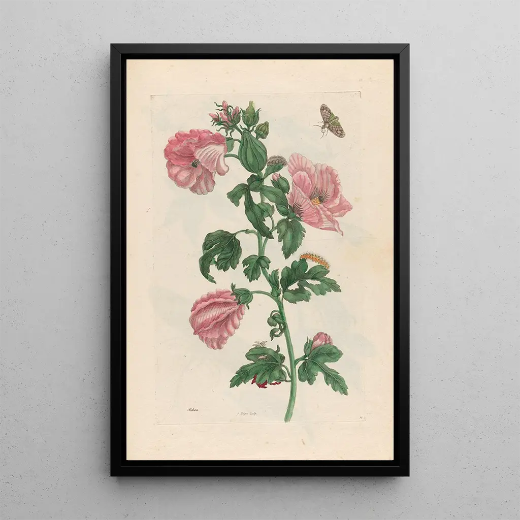 The art print of Althéa, created by Maria Sibylla Merian, transports us into a world of delicacy and fascination for nature. The meticulous details of the flowers and insects, rendered with remarkable precision, testify to the artist's attentive observation. The vibrant colors and subtle nuances create a harmonious composition, where each element seems to interact with the others. This piece, at the crossroads of art and science, invites deep contemplation of the beauty of the natural world, while celebrating the diversity of life.