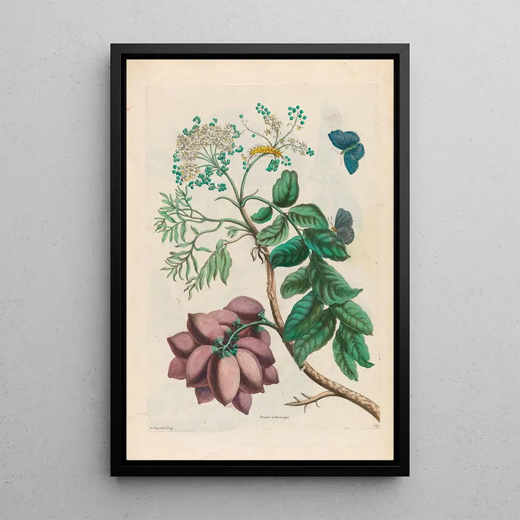The art print of the American Plum Tree, a masterpiece by Maria Sibylla Merian, transports us to a world where the beauty of nature is showcased with exceptional finesse. This canvas accurately depicts the details of this plant, its delicate flowers, and vibrant colors. The shades of violet and white blend harmoniously, creating a soft and soothing atmosphere. The engraving technique, used by Merian, captures the texture and shape of natural elements, offering the viewer an invitation to explore the wonders of botany.