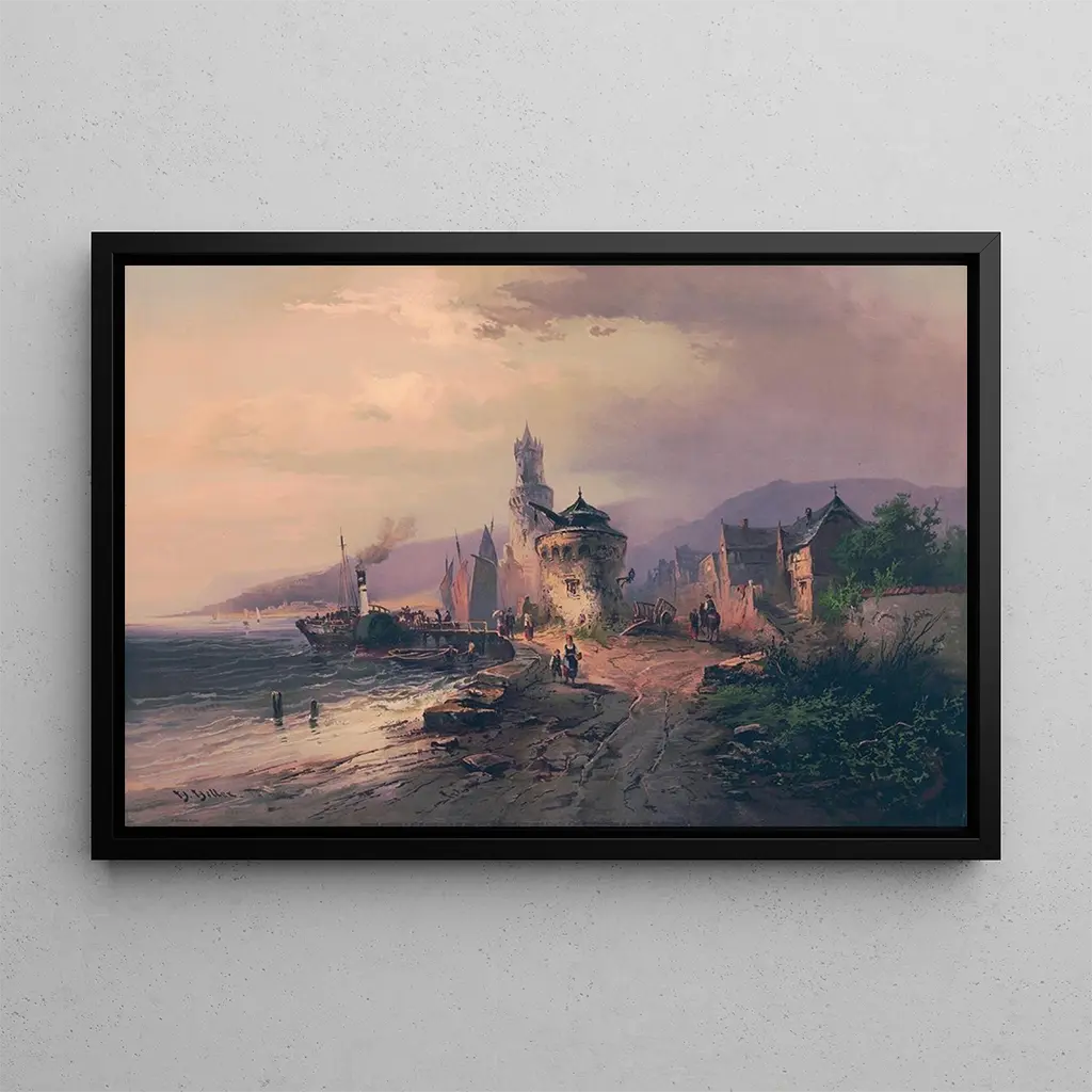 The art print of Andernach on the Rhine, created by Heinrich Hiller, transports us to the heart of a historic landscape where the river meanders majestically. The soft hues of the water blend with the reflections of ancient buildings, creating a peaceful and nostalgic atmosphere. Hiller's technique, which combines realism and romanticism, allows us to feel the soul of this German city. Every detail, from the sails of the boats to the trees lining the river, is carefully rendered, inviting the viewer to explore this painting as a lively scene. This work is a true celebration of the harmony between man and nature.